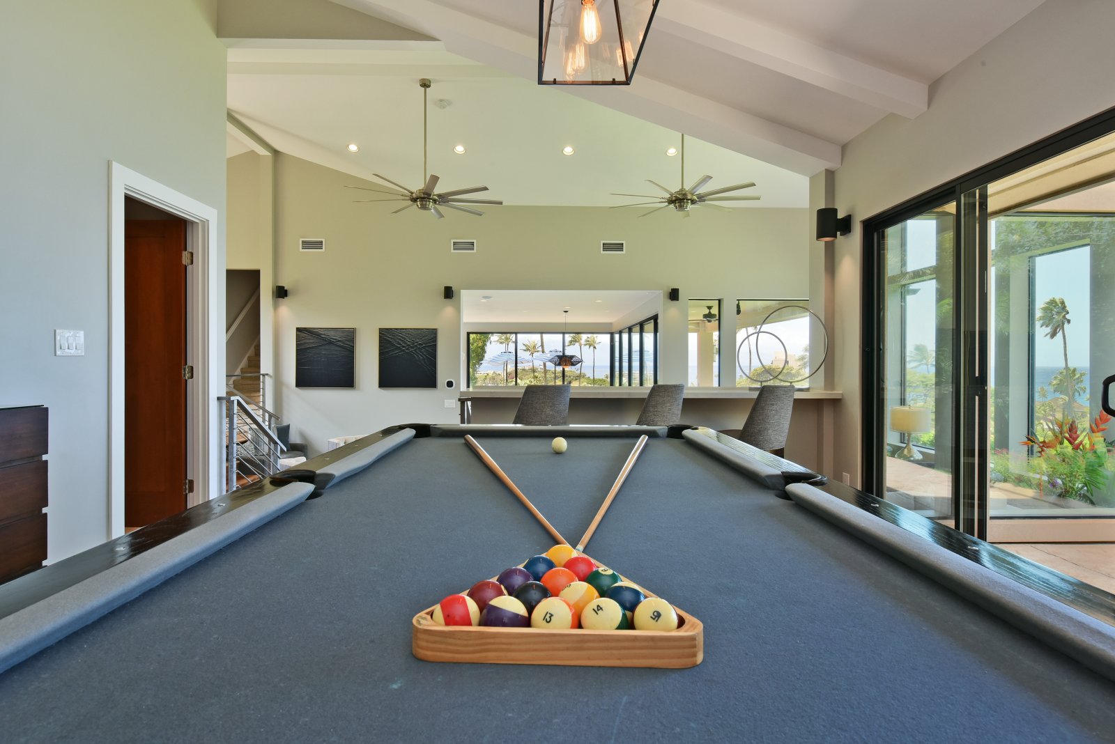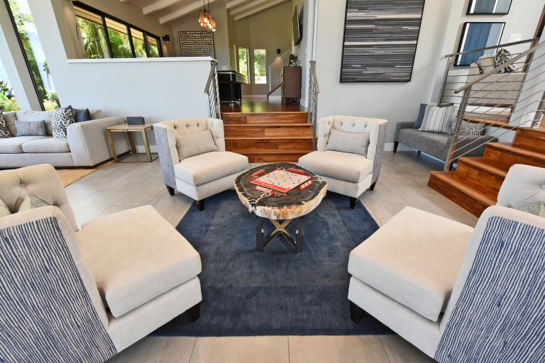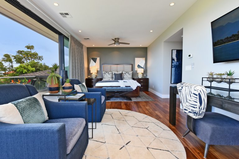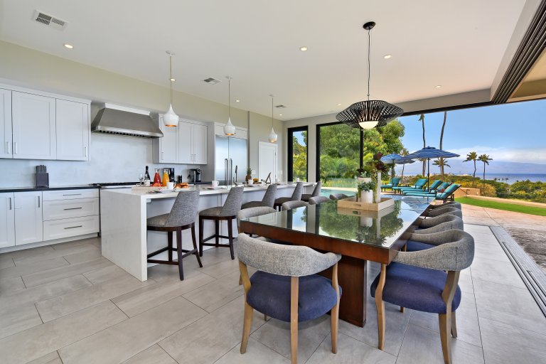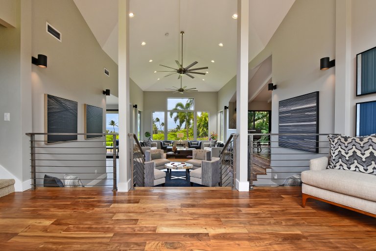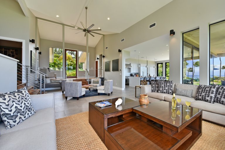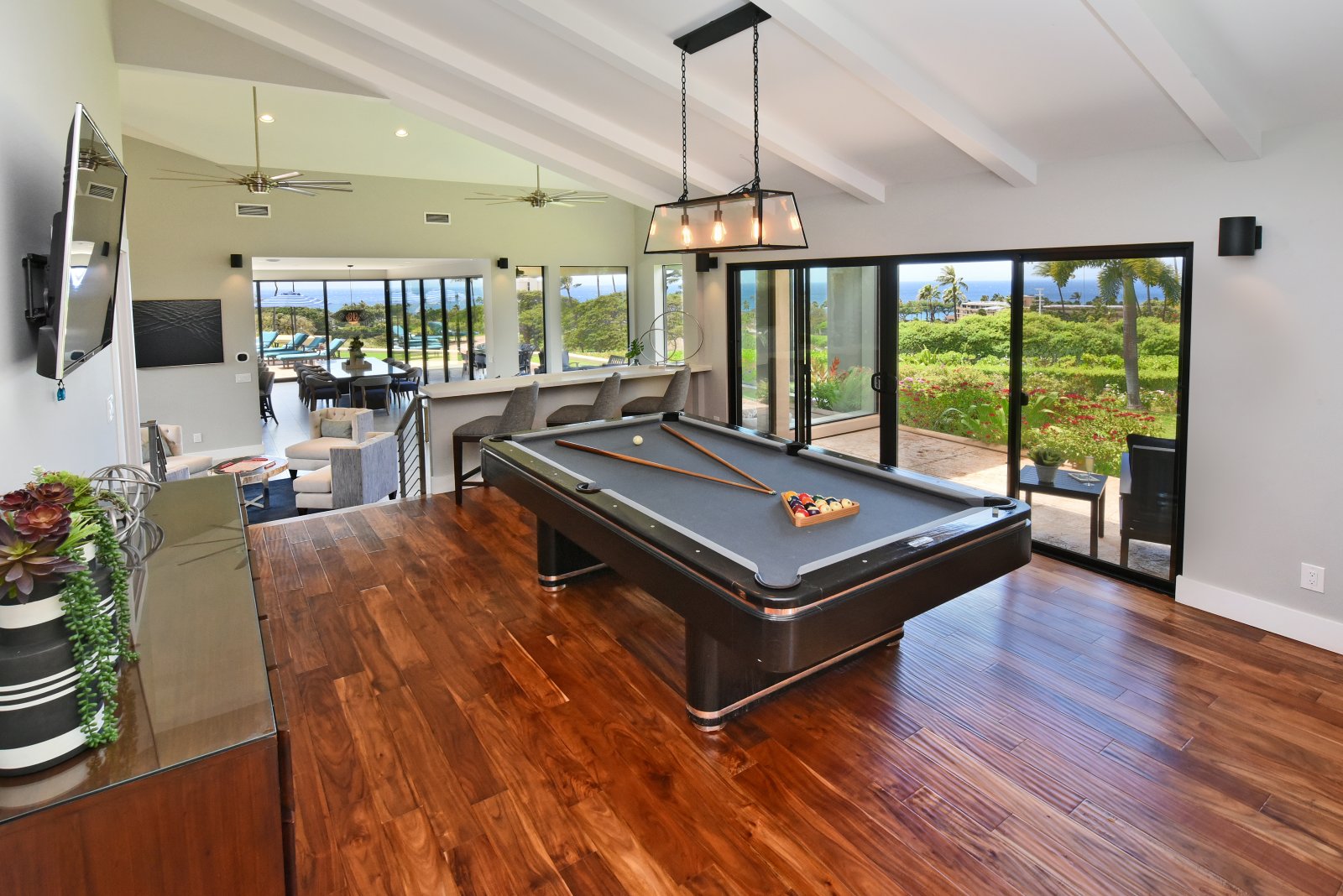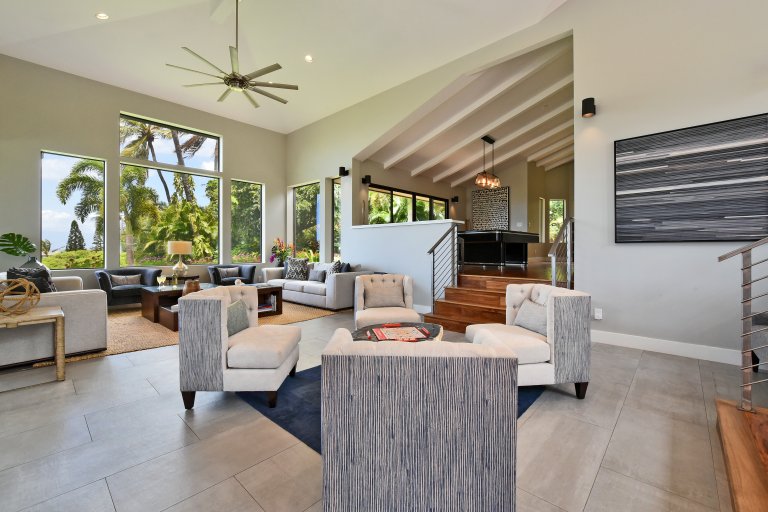 Photos don't accurately capture the leisure and relaxation found in the central living area of Hale Nui. Whether you choose to read a book, listen to your favorite playlist, or roll around the floor with toddlers – you'll enjoy any activity in natural sunlight gleaming through colossal picture windows, and under the highest ceilings. The billiard room sits above the living area and has a big screen TV and bar seating. In this same space, you'll find a media/game room with a 55” 4K TV with built-in ROKU and board games on the shelves.