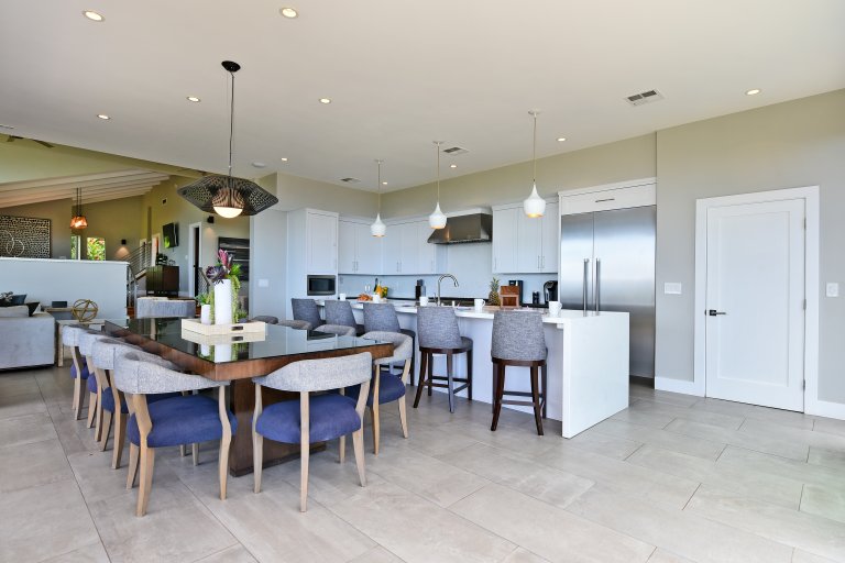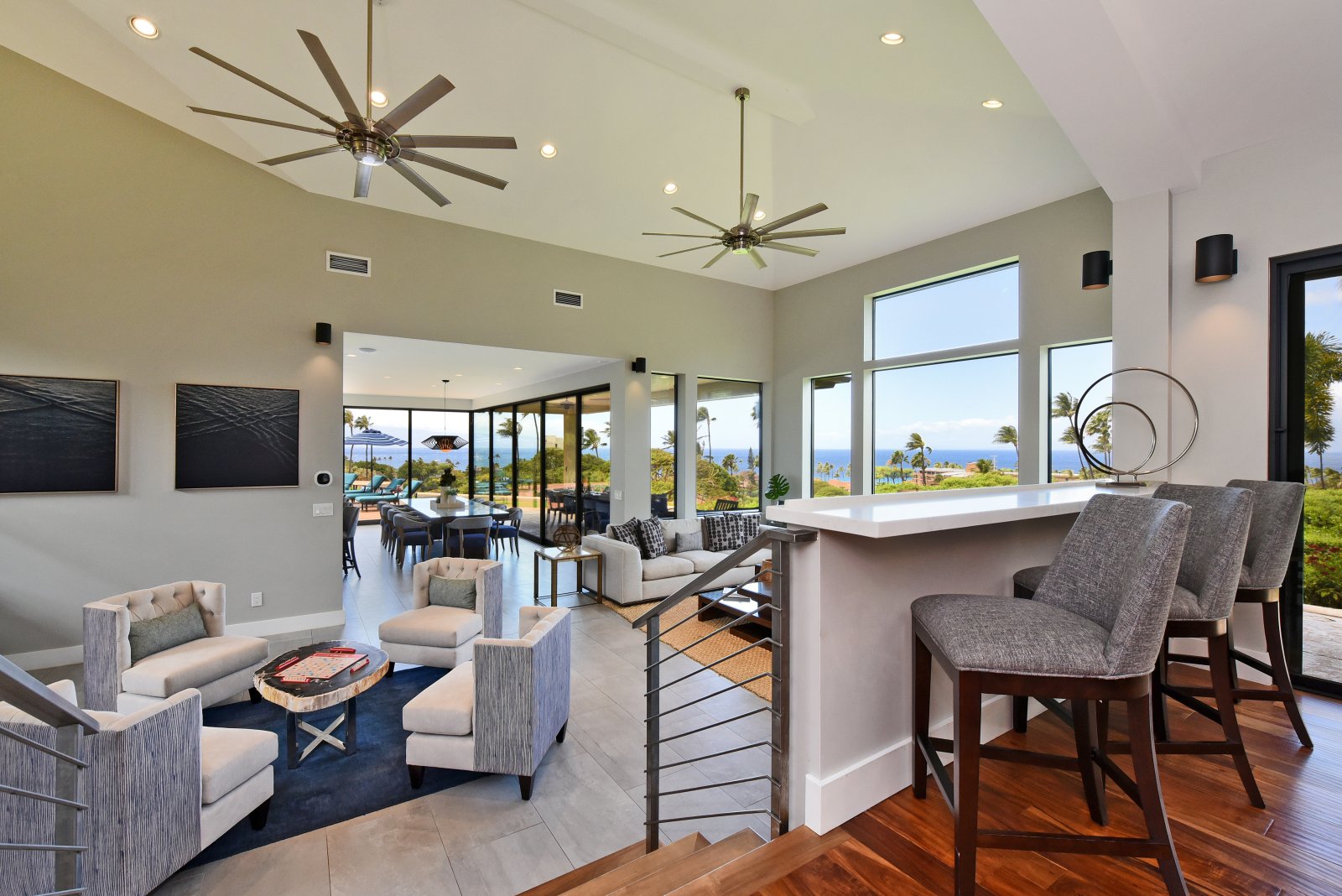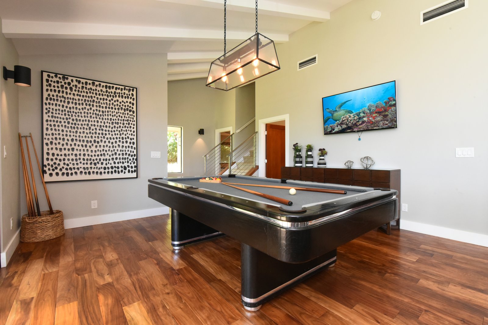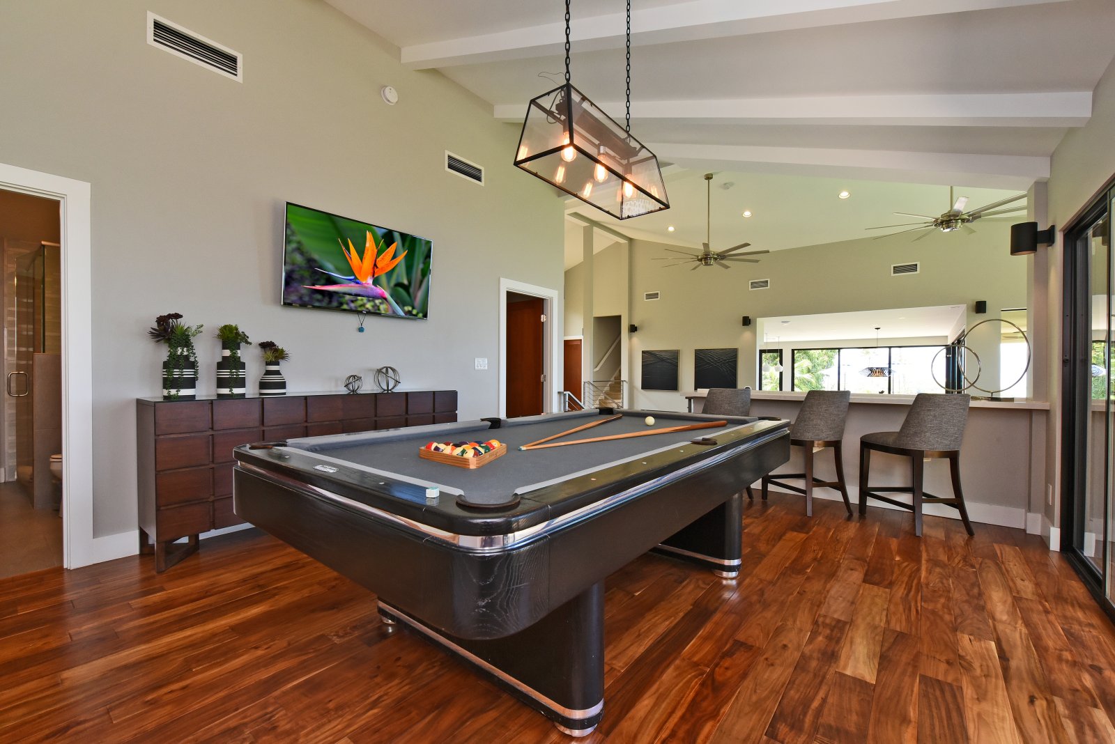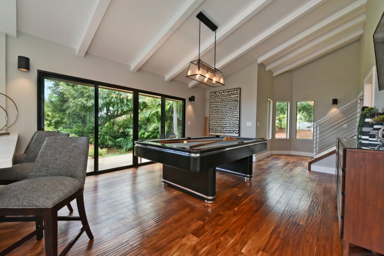 Photos don't accurately capture the leisure and relaxation found in the central living area of Hale Nui. Whether you choose to read a book, listen to your favorite playlist, or roll around the floor with toddlers – you'll enjoy any activity in natural sunlight gleaming through colossal picture windows, and under the highest ceilings. The billiard room sits above the living area and has a big screen TV and bar seating. In this same space, you'll find a media/game room with a 55” 4K TV with built-in ROKU and board games on the shelves.