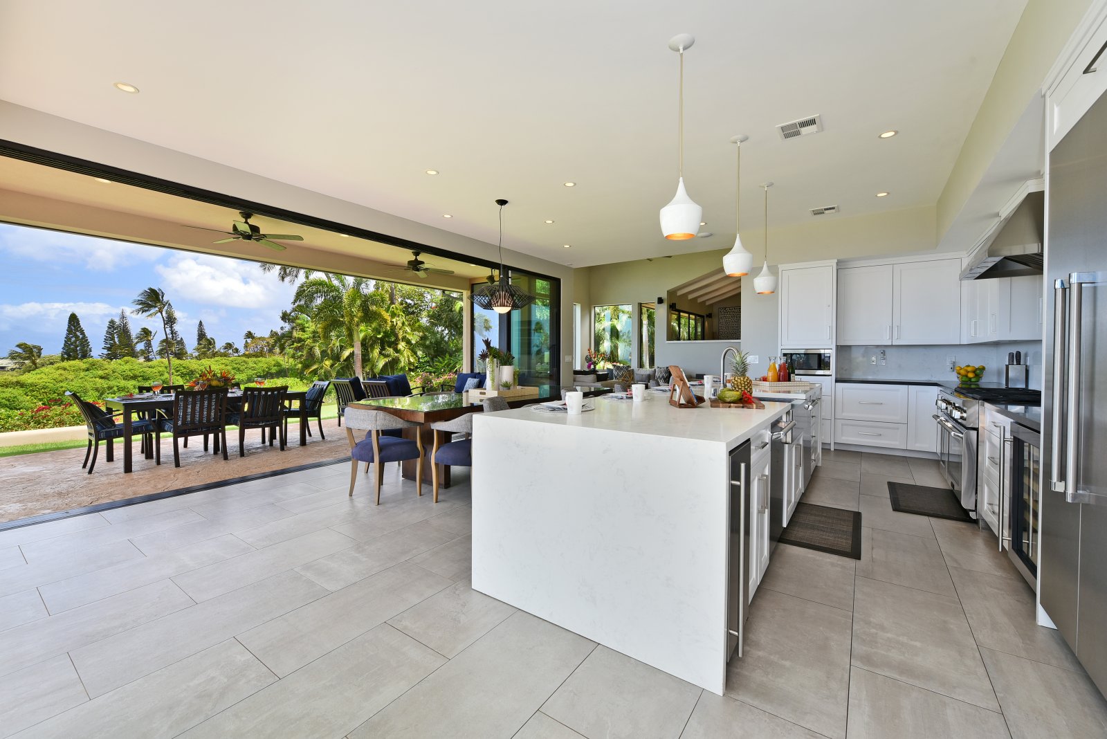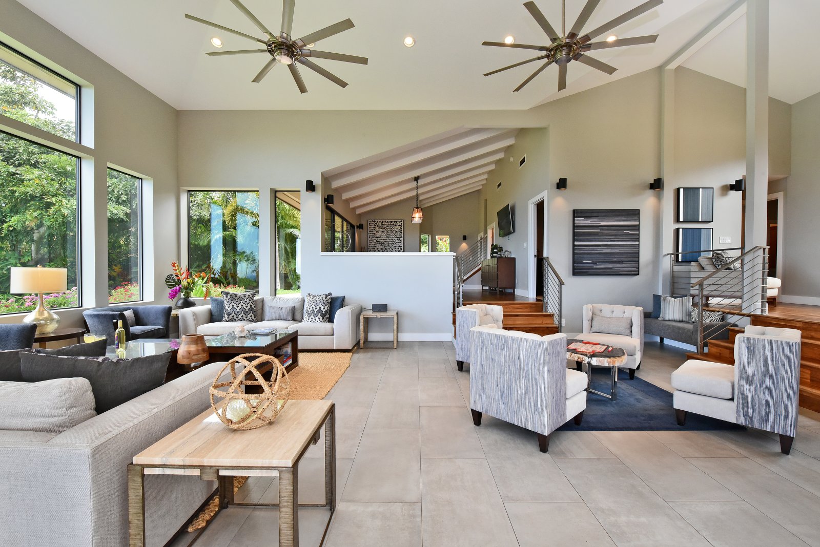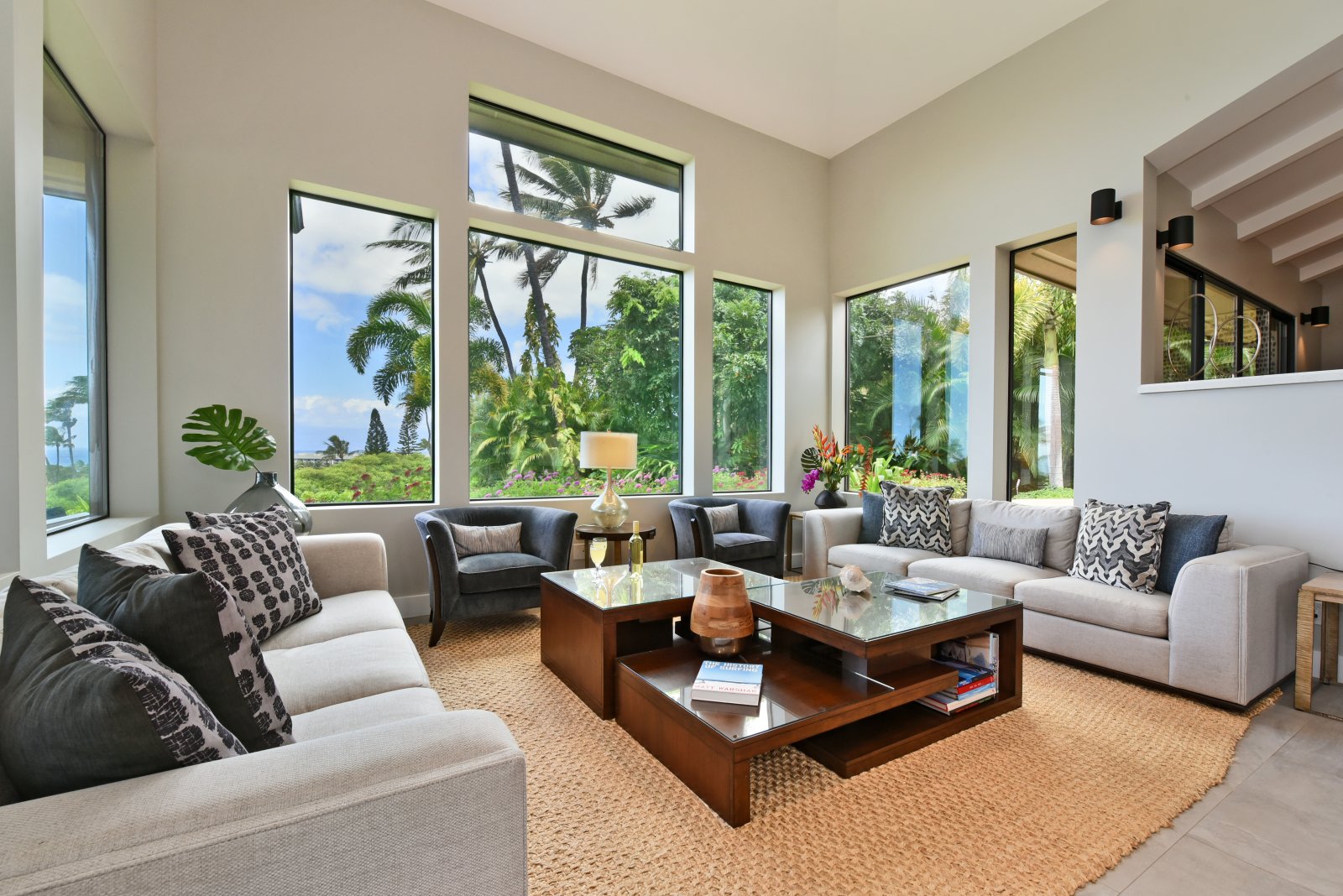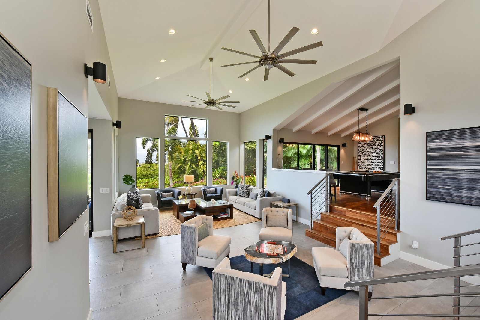 Photos don't accurately capture the leisure and relaxation found in the central living area of Hale Nui. Whether you choose to read a book, listen to your favorite playlist, or roll around the floor with toddlers – you'll enjoy any activity in natural sunlight gleaming through colossal picture windows, and under the highest ceilings. The billiard room sits above the living area and has a big screen TV and bar seating. In this same space, you'll find a media/game room with a 55” 4K TV with built-in ROKU and board games on the shelves.