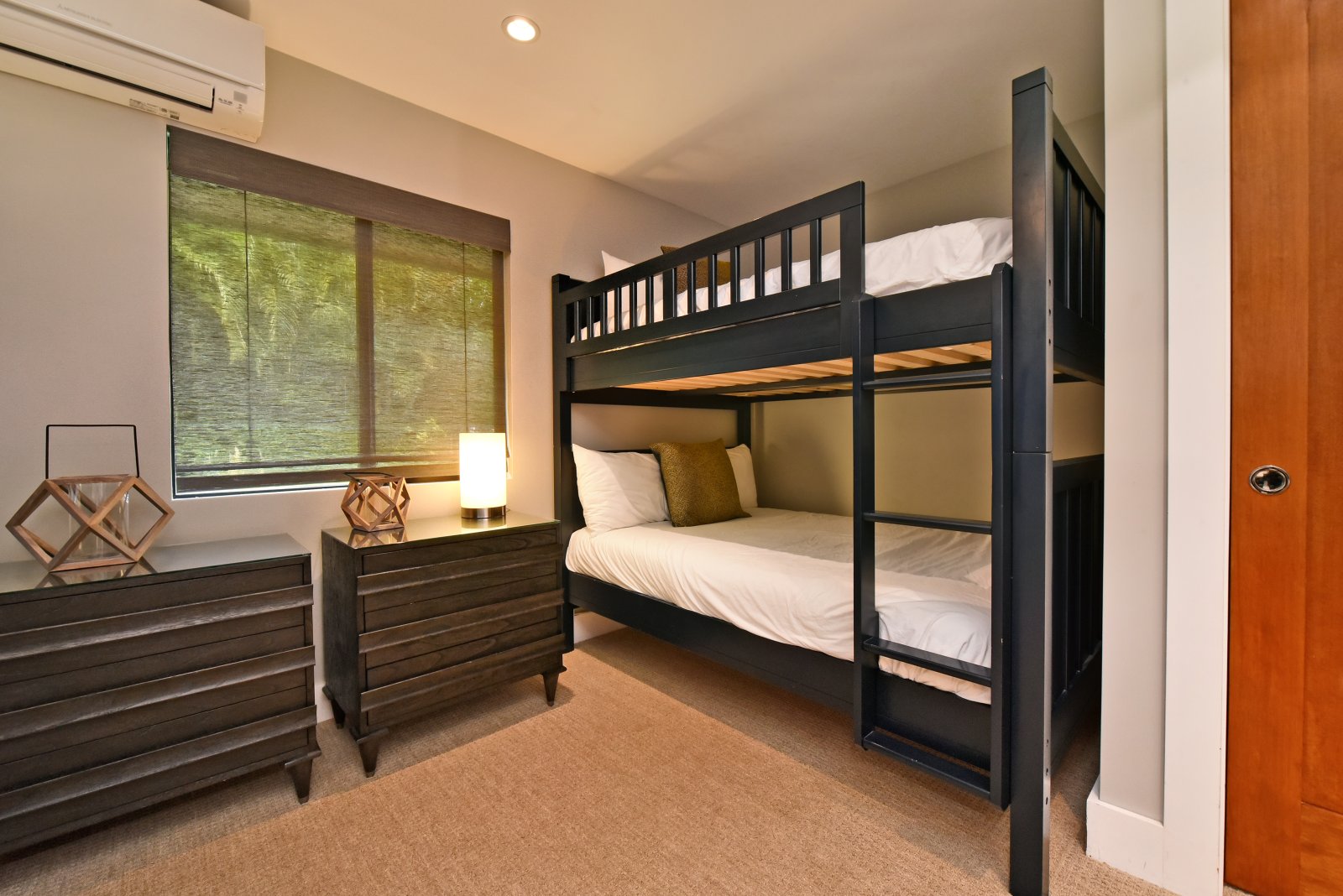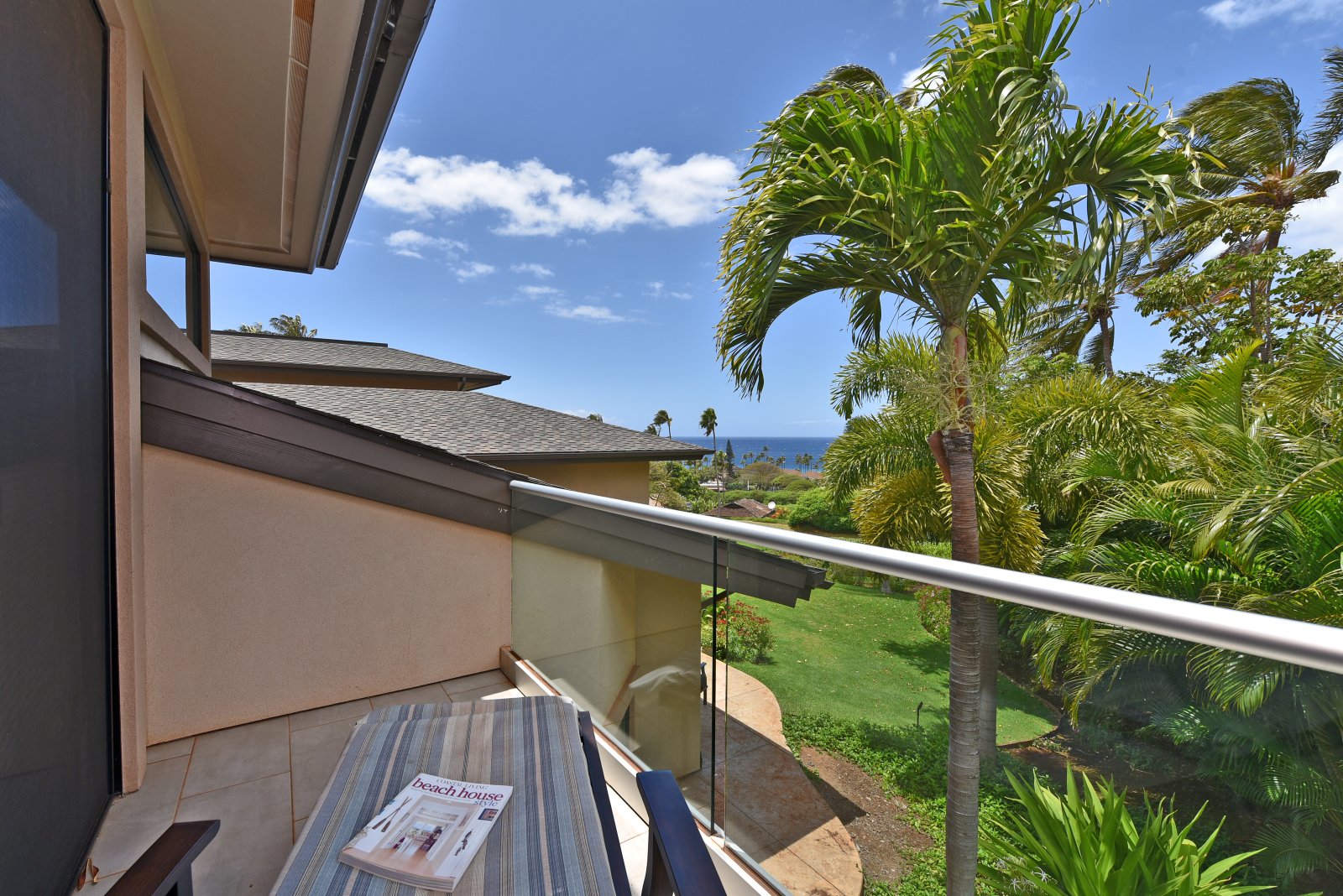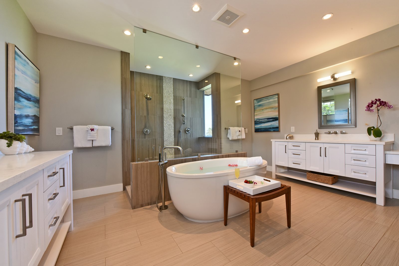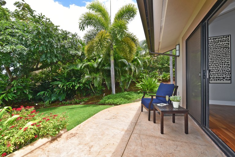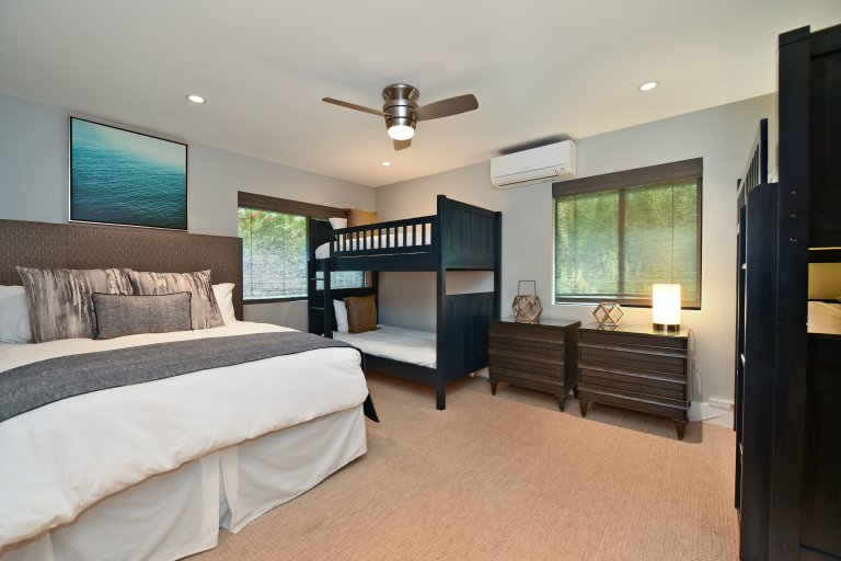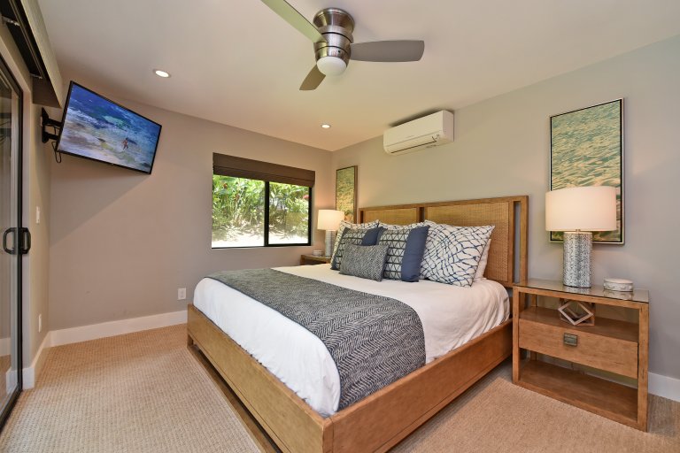 Each of the bedrooms serves as a private retreat! The upstairs master suites are furnished with new King-sized beds, flat-screen TVs, and contemporary bathrooms, isolated lanais with ocean views. In a downstairs corner of the home, is a bedroom with a King-sized bed, flat-screen TV, and ensuite bathroom. In a separate hall, you'll find the Kids' room furnished with a Queen-sized bed, 1 bunk set with 2 full beds, and 1 bunk set with 2 twin beds – also with an ensuite bathroom. Further down the hall is another bedroom with a Queen-sized bed, flat-screen TV, and an ensuite bathroom.