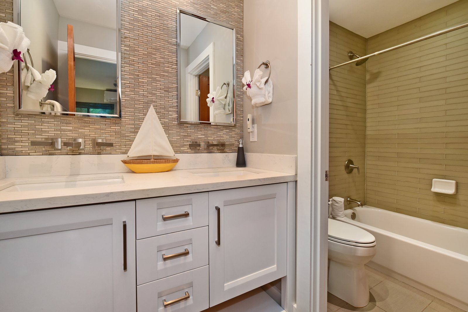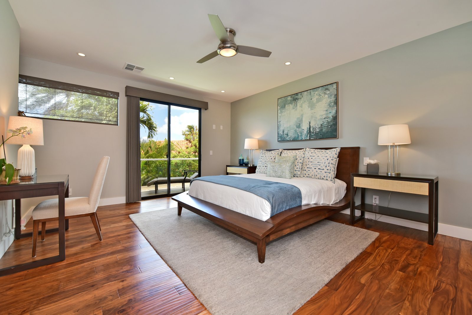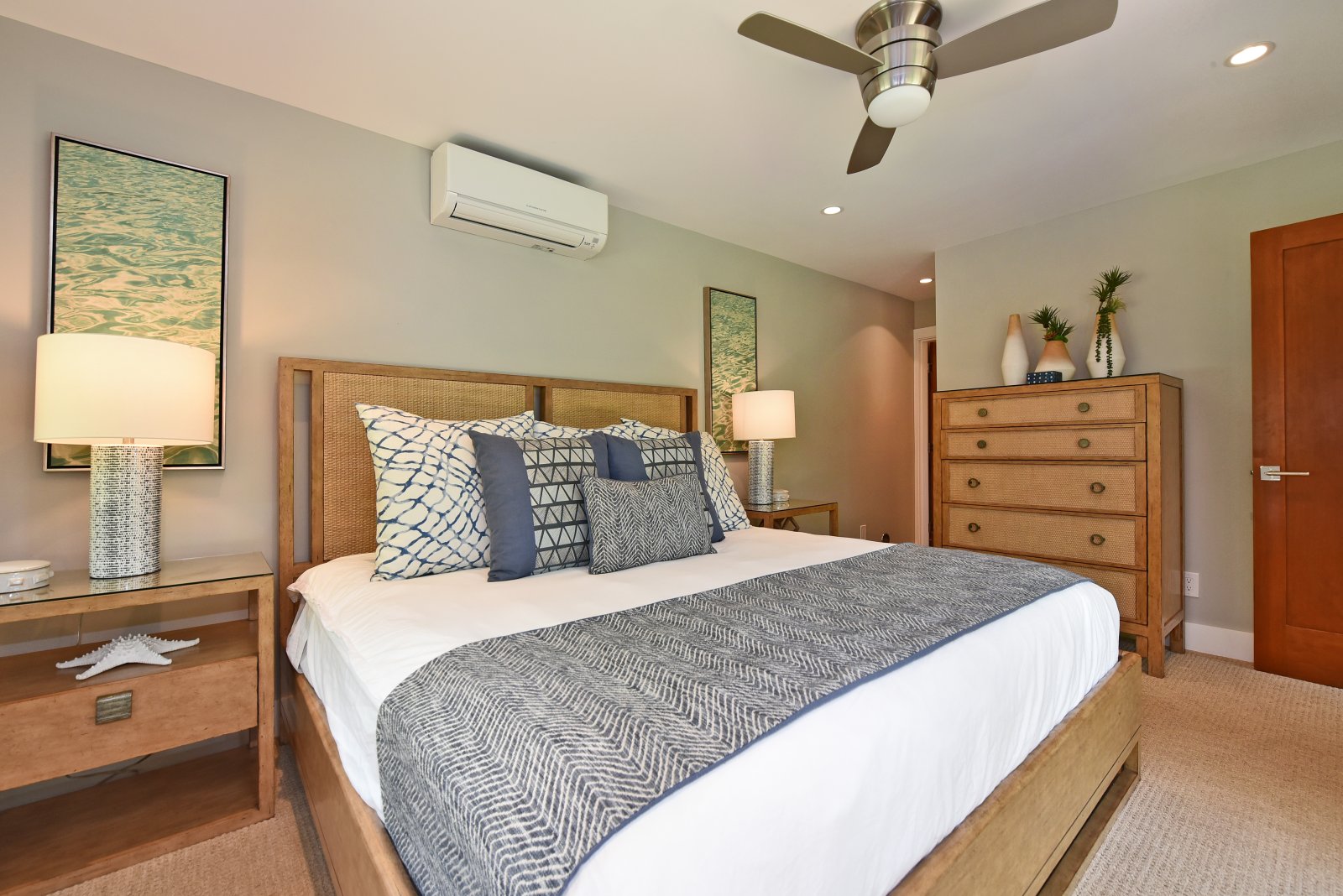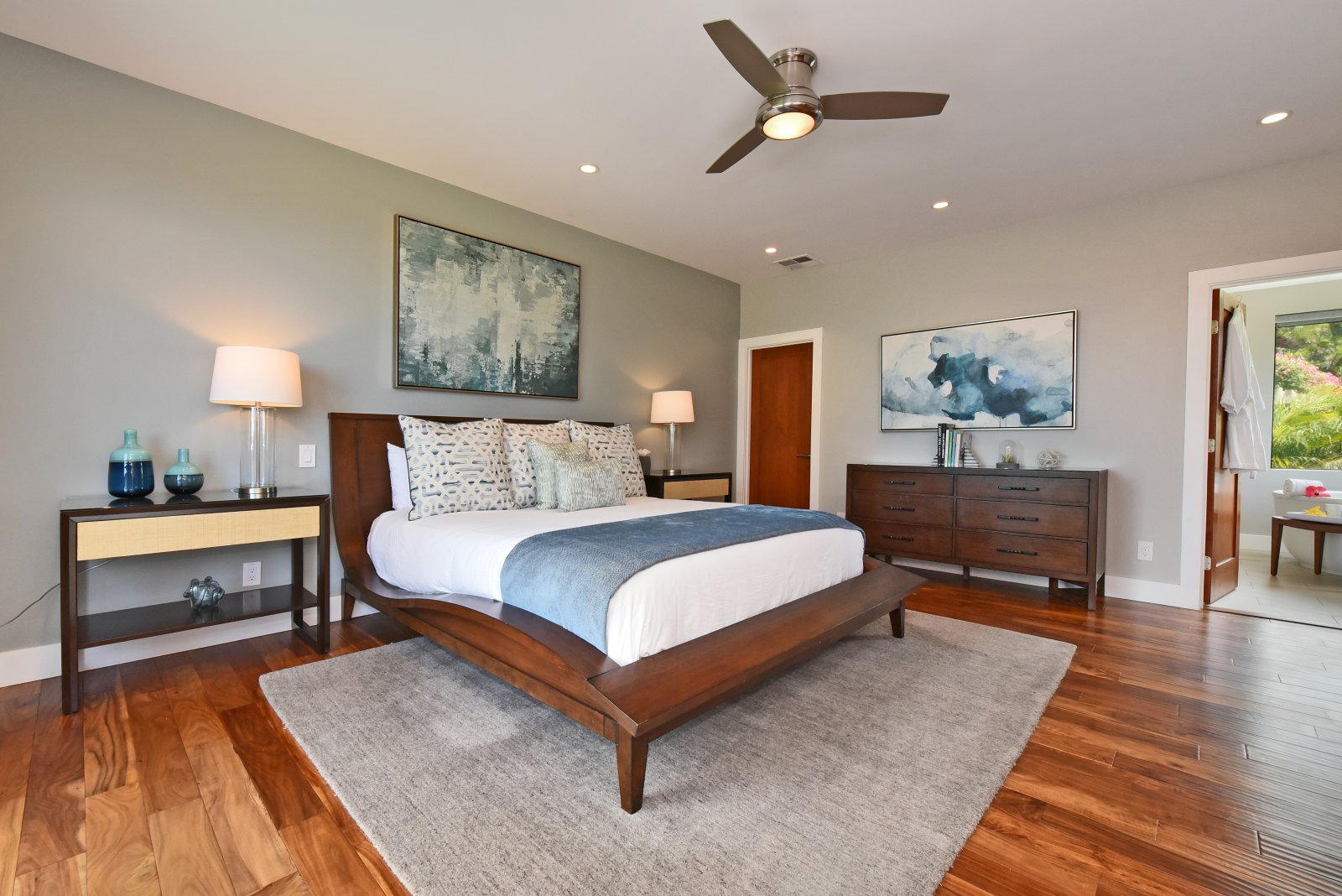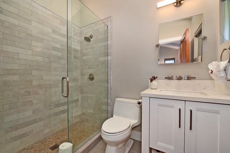 Each of the bedrooms serves as a private retreat! The upstairs master suites are furnished with new King-sized beds, flat-screen TVs, and contemporary bathrooms, isolated lanais with ocean views. In a downstairs corner of the home, is a bedroom with a King-sized bed, flat-screen TV, and ensuite bathroom. In a separate hall, you'll find the Kids' room furnished with a Queen-sized bed, 1 bunk set with 2 full beds, and 1 bunk set with 2 twin beds – also with an ensuite bathroom. Further down the hall is another bedroom with a Queen-sized bed, flat-screen TV, and an ensuite bathroom.