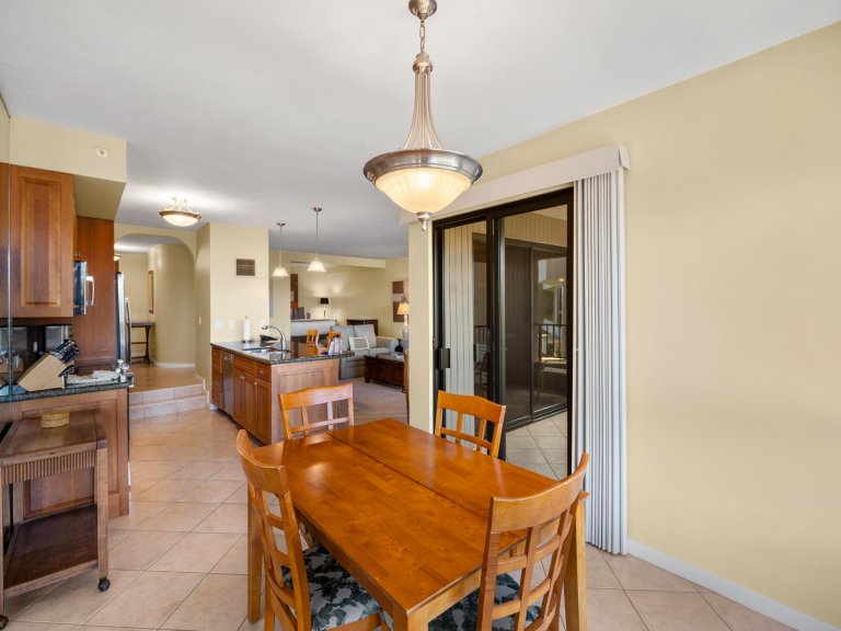 The fully stocked gourmet kitchen features high-end stainless steel appliances, dark granite countertops, and ample cabinetry that complements the home’s classic design. The dining area comfortably seats four and is positioned to enjoy natural light and peaceful surroundings.