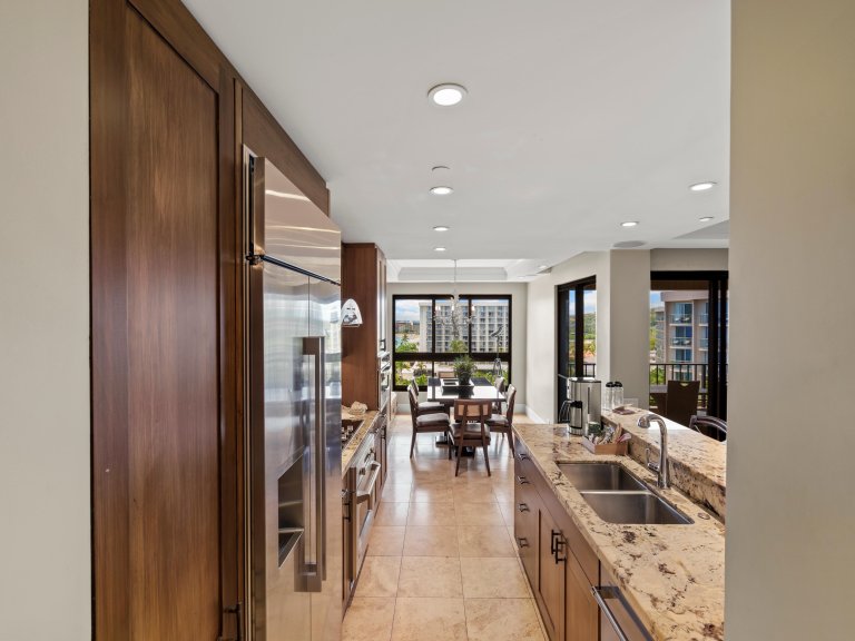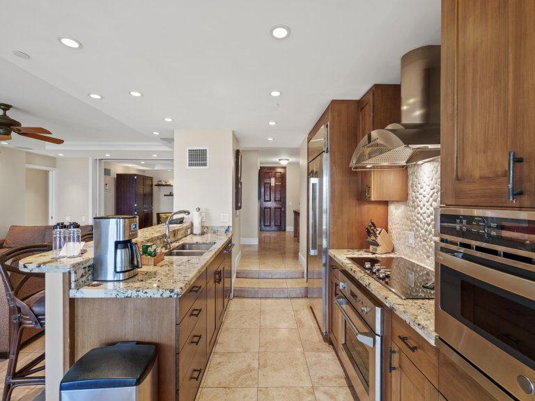 The fully equipped gourmet kitchen features high-end stainless steel appliances, generous counter space, and ample cabinetry for extended stays. Whether preparing breakfast before a beach walk or hosting dinner after sunset, the kitchen is designed to support effortless entertaining.
