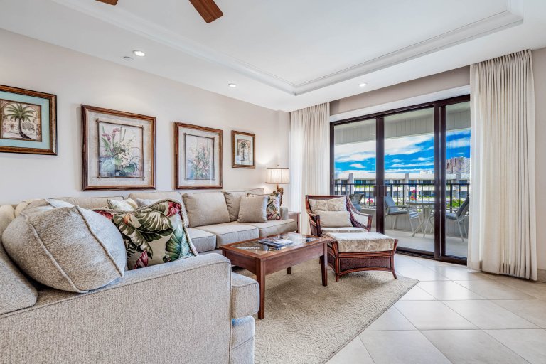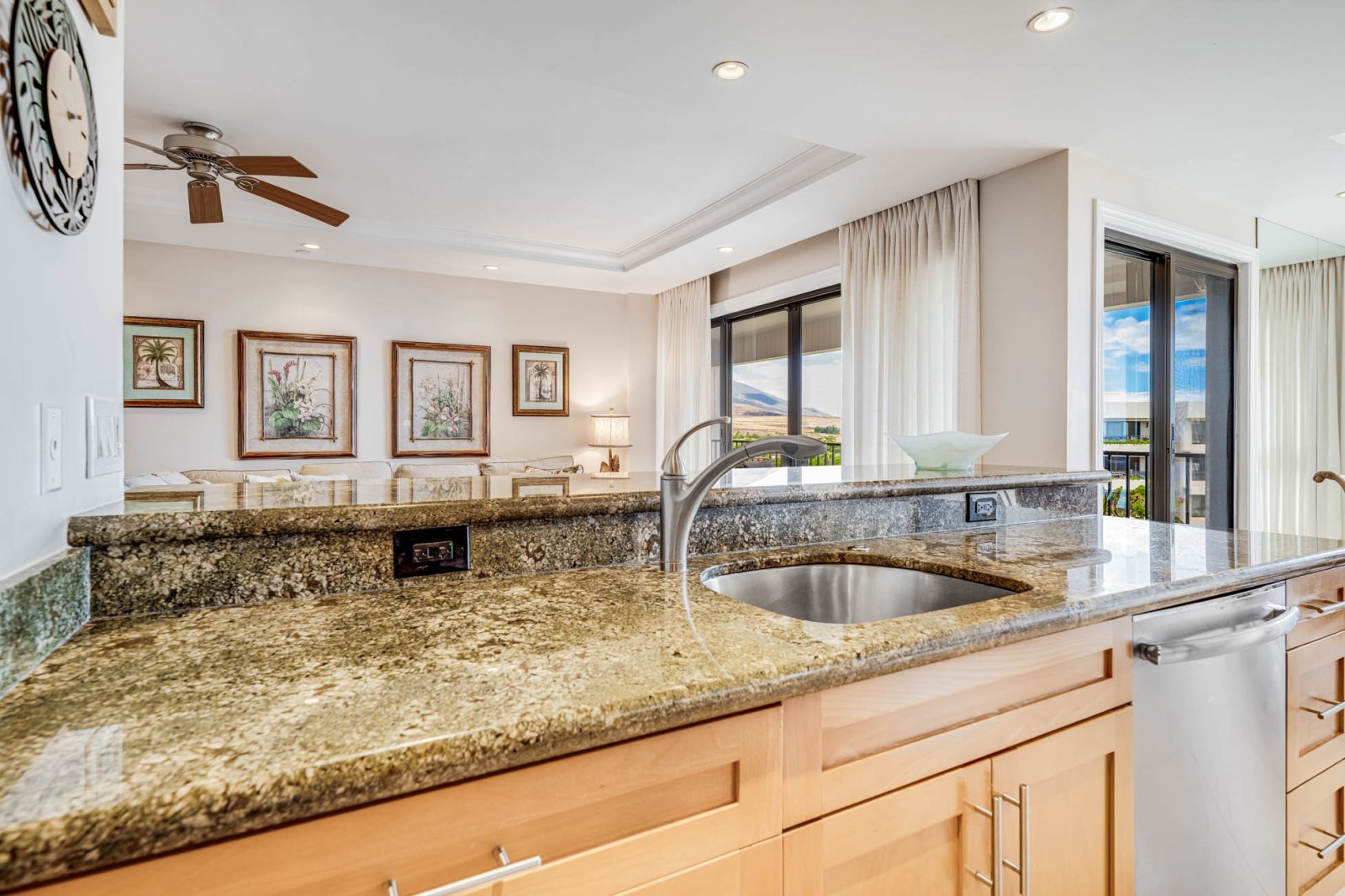Expansive windows fill the residence with natural light while showcasing panoramic ocean views. The open-concept living area flows effortlessly to a private lanai, creating a seamless indoor-outdoor experience that defines Kaʻanapali beachfront living.