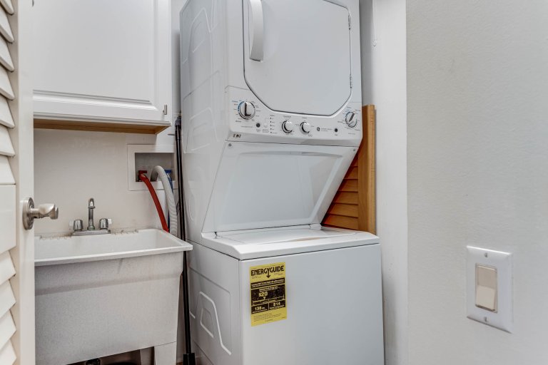 A full-size washer and dryer are located within the residence for convenience during extended stays. Central air conditioning, cable-equipped televisions, stereo system, and high-speed Wi-Fi ensure modern comfort throughout.