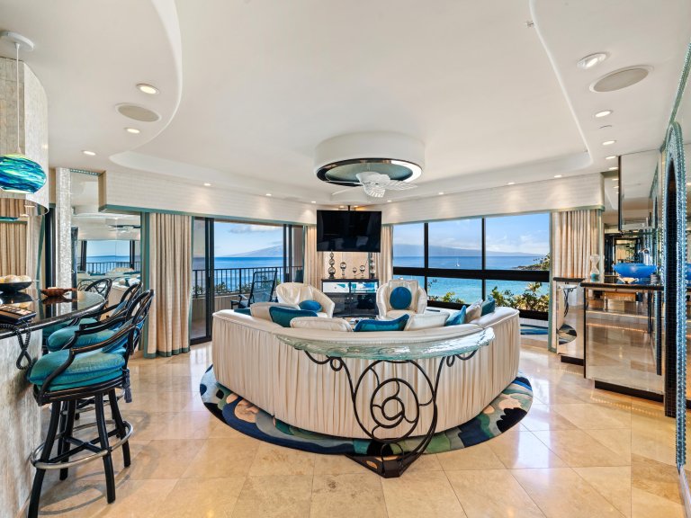 A custom curved sofa in the living room is positioned to capture the ocean vista, offering a comfortable space to relax or enjoy the wall-mounted flat screen television. The open-concept design allows the living and dining areas to flow seamlessly toward the lanai, enhancing the indoor-outdoor lifestyle that defines Kaʻanapali beachfront living.