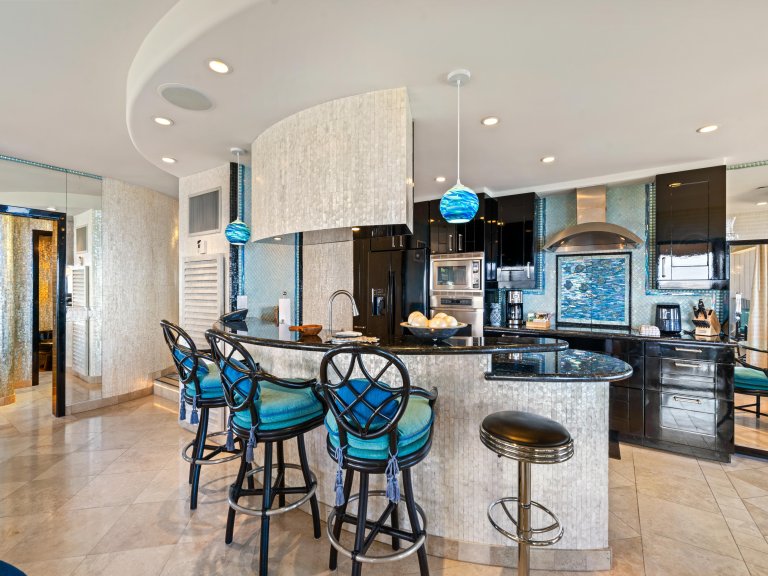 The interior design reflects the colors and energy of the surrounding ocean, with blue accents, modern furnishings, and an open layout that maximizes natural light. Expansive windows frame sweeping water views, creating a bright and inviting atmosphere throughout the residence.