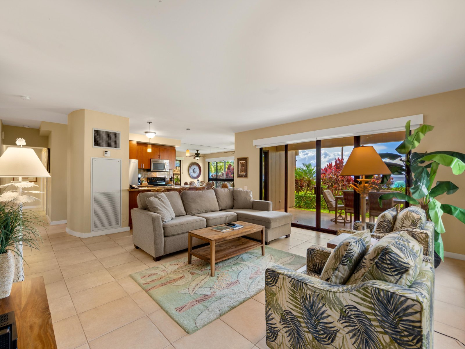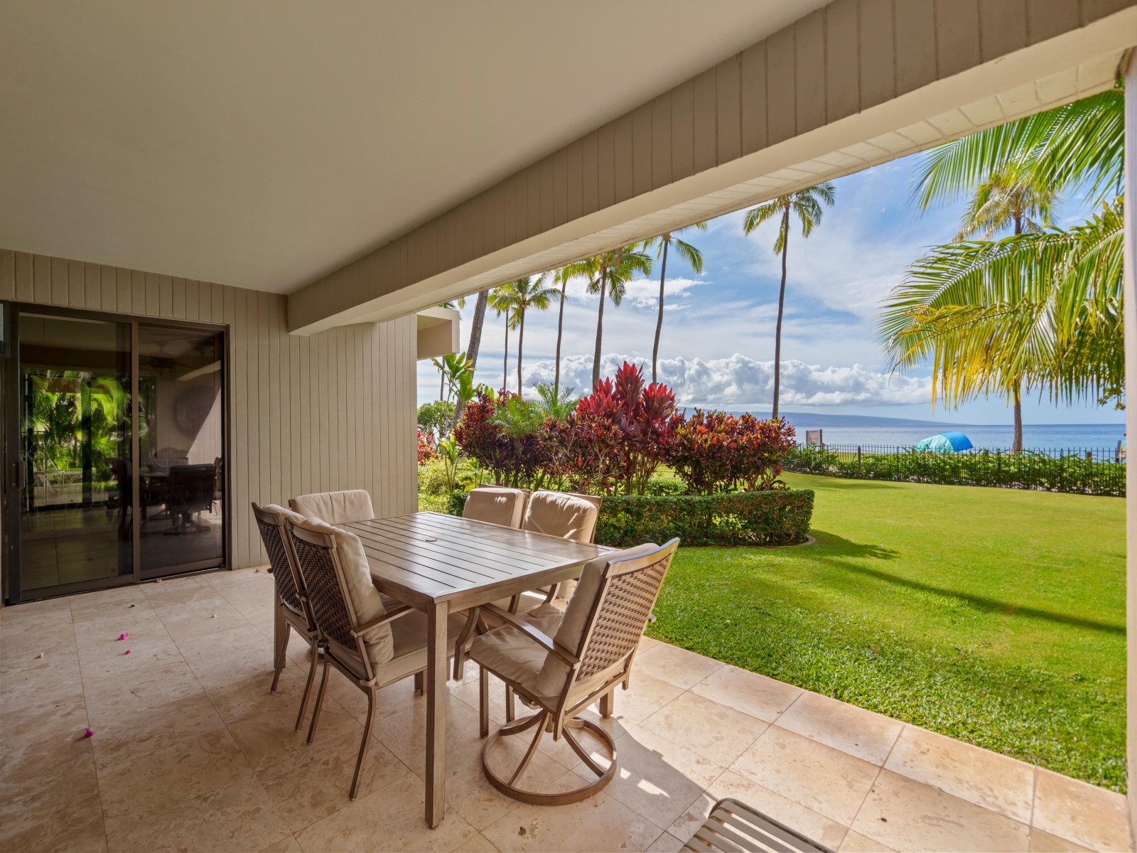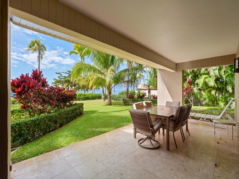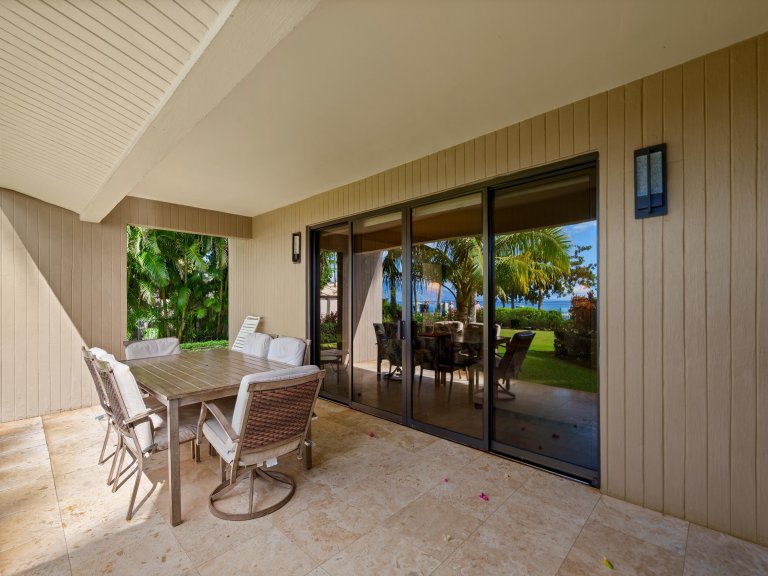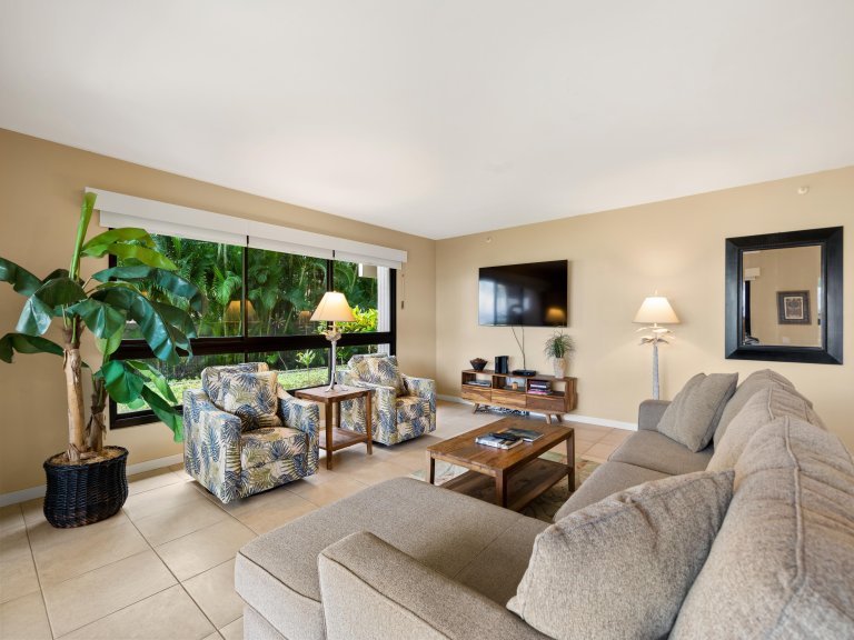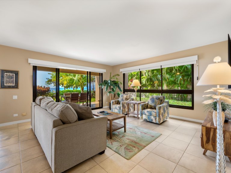 The expansive living room is designed for comfort and connection, featuring open seating areas that invite conversation or quiet evenings after a day on the beach. Natural light pours through large windows, highlighting tropical tones and relaxed island textures throughout the space.The living area opens directly to the private lanai, allowing guests to enjoy the ocean breeze and sweeping coastal views from both indoors and out.