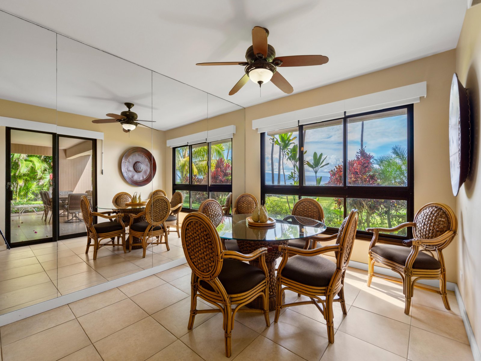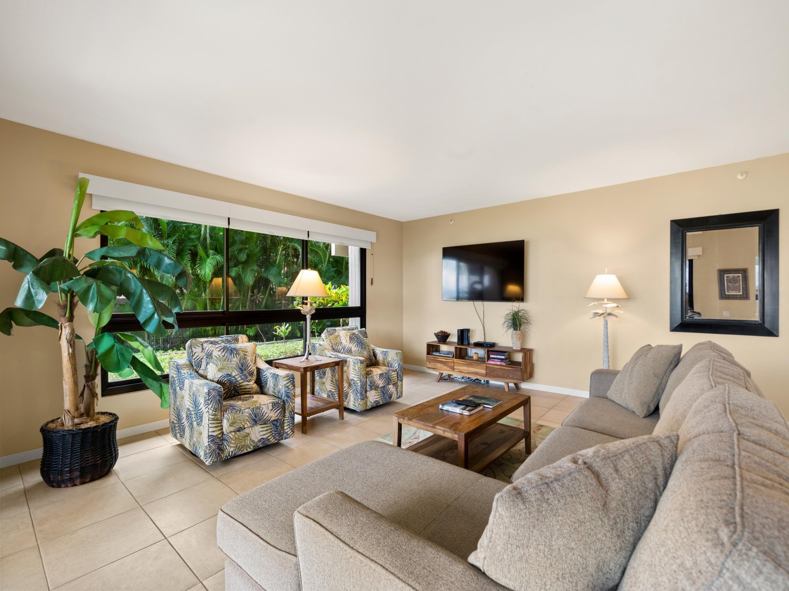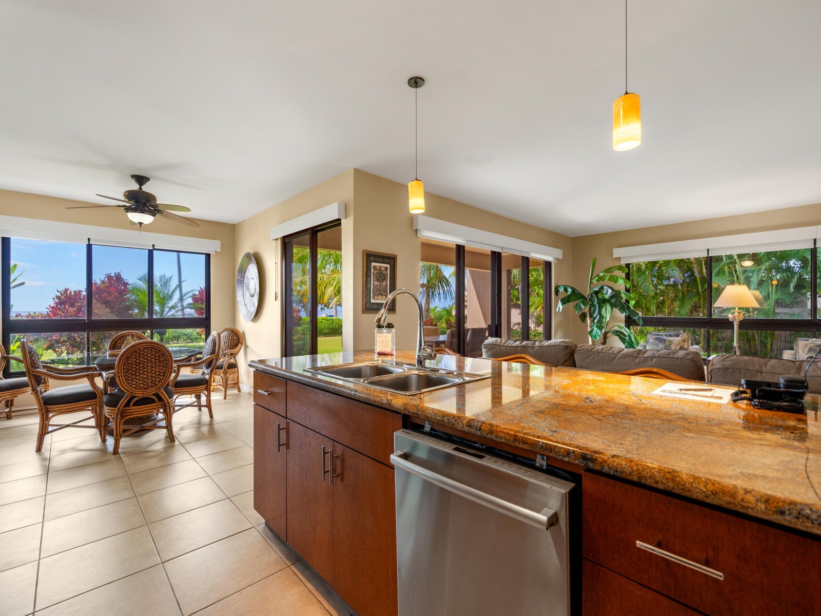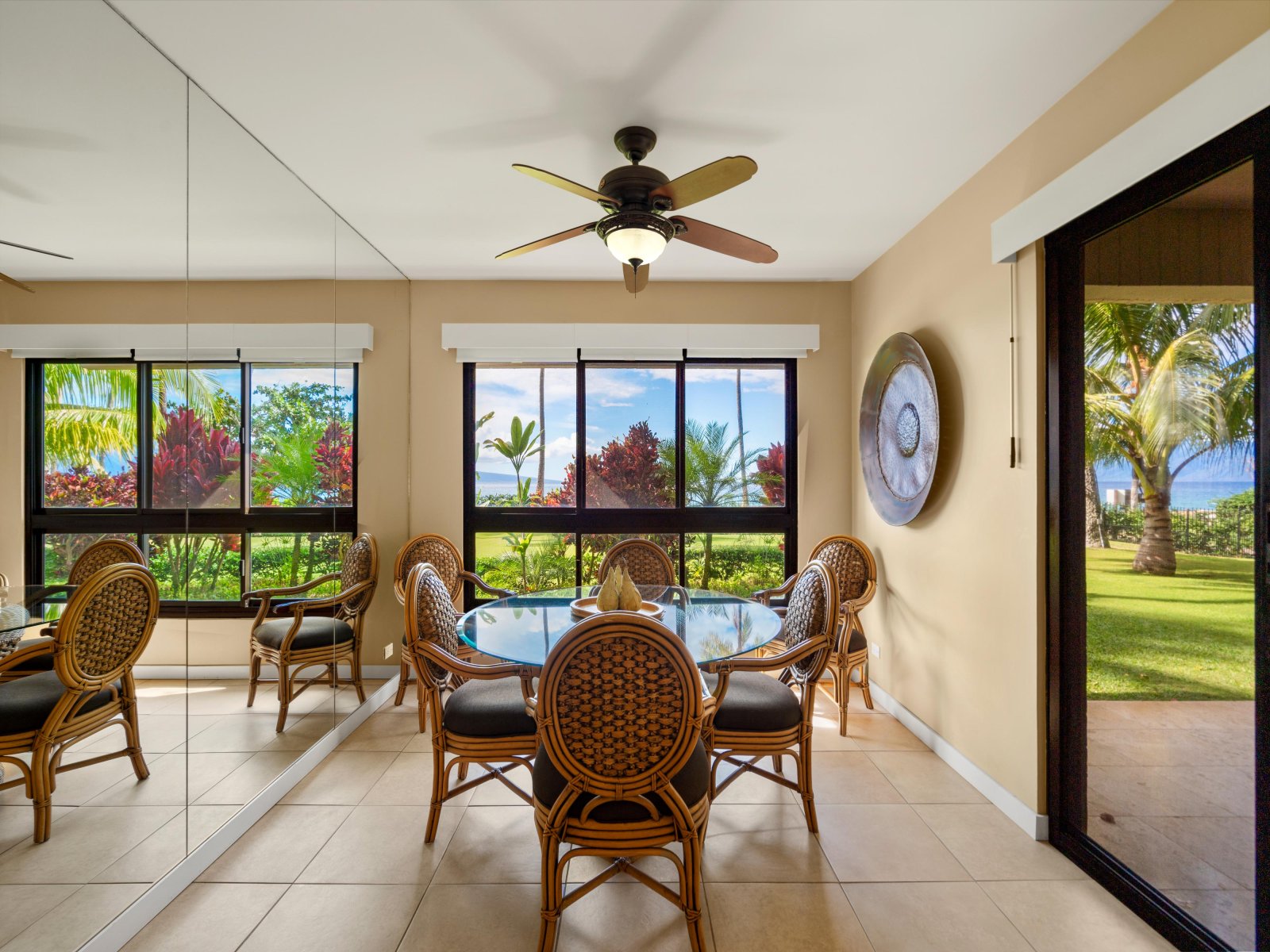 The expansive living room is designed for comfort and connection, featuring open seating areas that invite conversation or quiet evenings after a day on the beach. Natural light pours through large windows, highlighting tropical tones and relaxed island textures throughout the space.The living area opens directly to the private lanai, allowing guests to enjoy the ocean breeze and sweeping coastal views from both indoors and out.