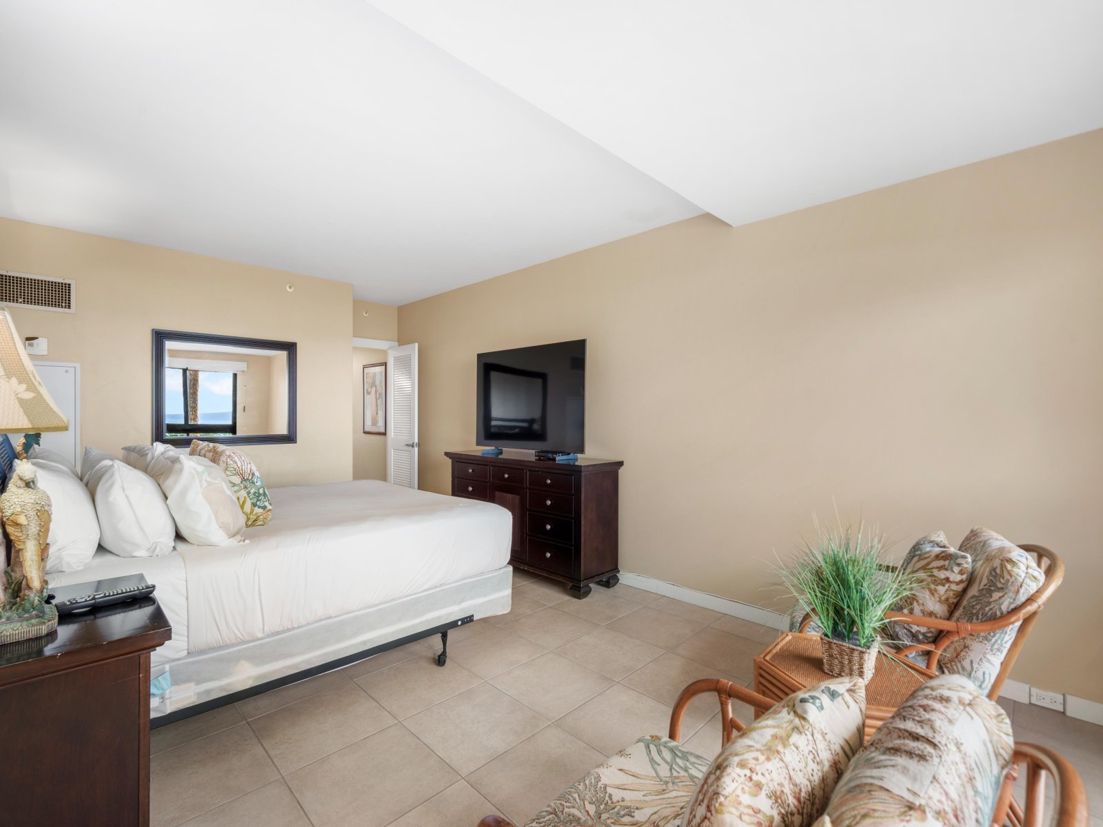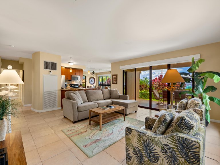 Large windows and a private lanai frame panoramic ocean vistas and vibrant West Maui sunsets. During the winter and early spring months, guests often enjoy sightings of migrating humpback whales passing just offshore. With generous interior space, refined island décor, and direct access to resort amenities, this residence provides a relaxed yet luxurious base for experiencing Maui.Living Spaces