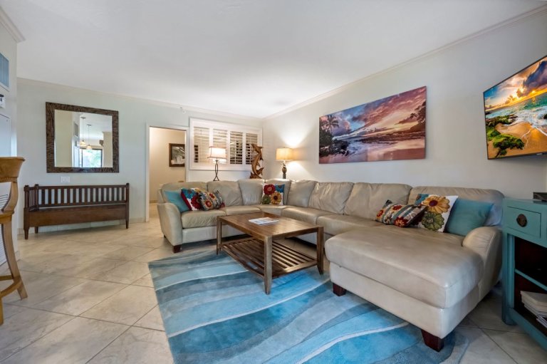 The open-concept living area is designed for gathering and relaxation. An oversized sectional sofa anchors the room, creating an inviting space for conversation, movie nights, or simply enjoying the island breeze drifting in from the lanai.