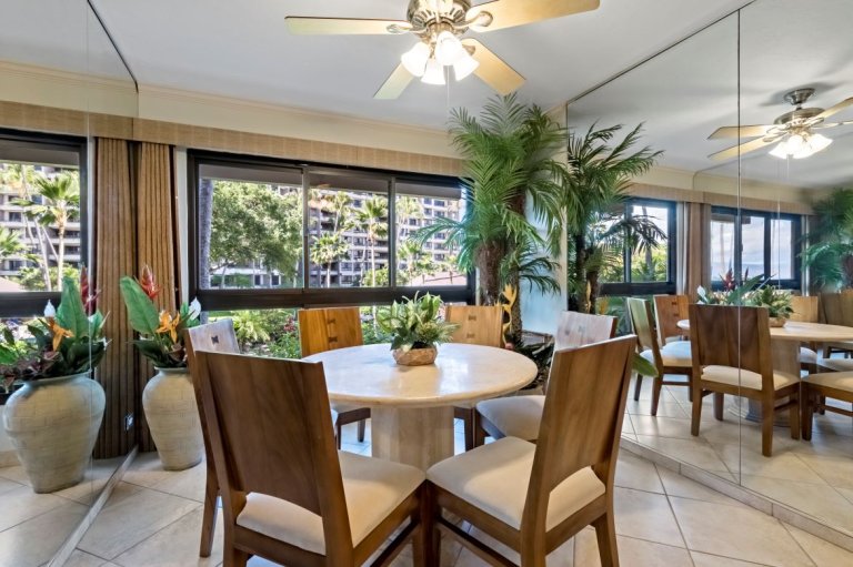 A formal dining area comfortably seats six, ideal for shared dinners and special occasions. For al fresco dining, step onto the private lanai and enjoy your meal outdoors surrounded by tropical landscaping and gentle ocean air.