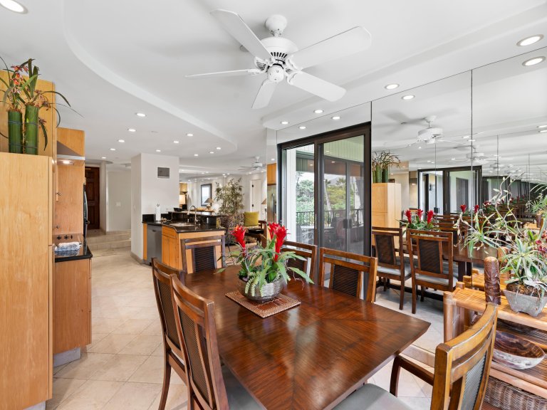 The interior features an open and light-filled layout that encourages effortless island living. Large windows welcome in abundant natural light, while warm neutral tones, light wood finishes, and locally inspired artwork create a polished coastal aesthetic. The living area flows naturally to the lanai, providing an ideal space for gathering, relaxing, or simply enjoying the ocean air.