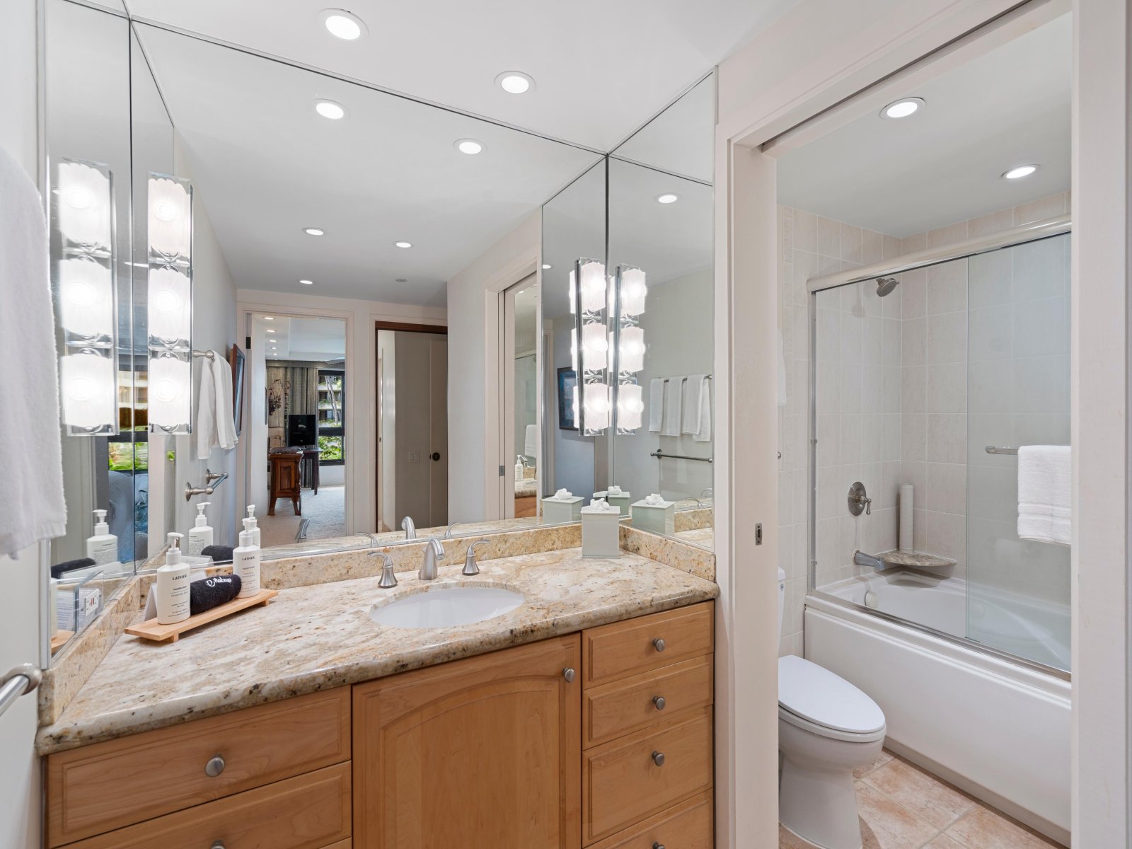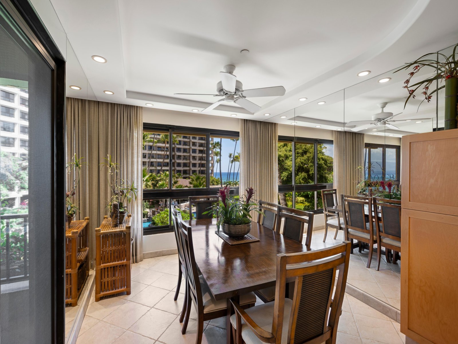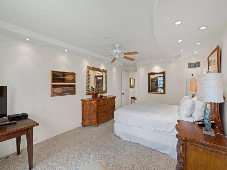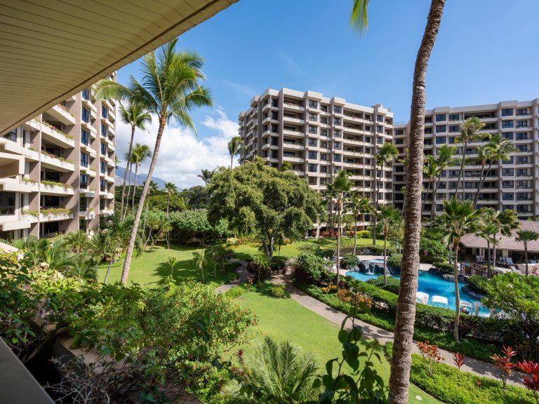From the private lanai, enjoy soothing ocean views framed by swaying palms, lush tropical landscaping, and views toward the resort’s sparkling pool. The setting captures the essence of island living, offering a peaceful atmosphere just steps from the beach.