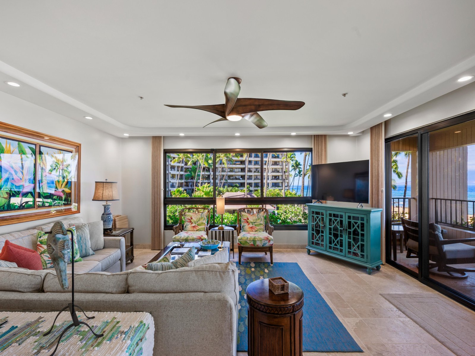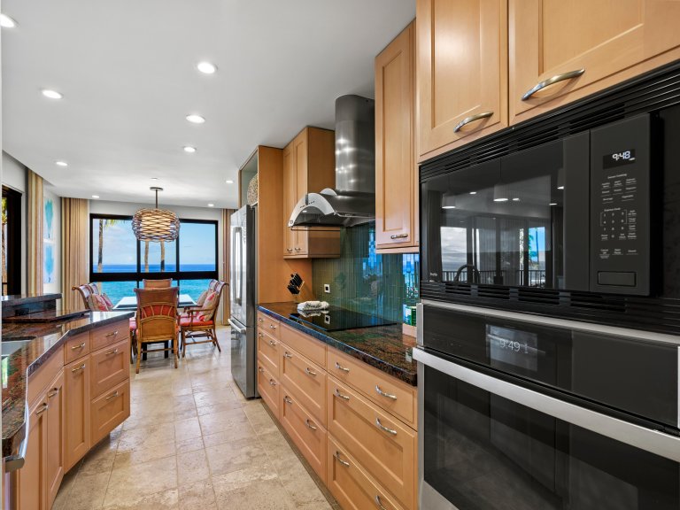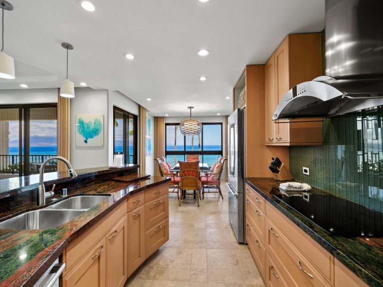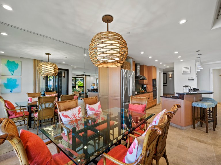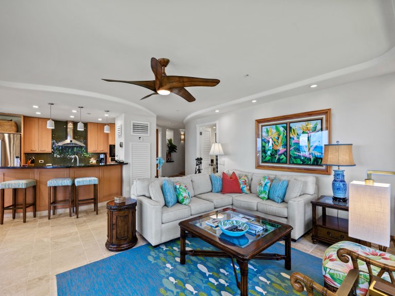 The interior design is contemporary and inviting, accented with vibrant touches inspired by Hawaiian wildlife and natural surroundings. At approximately 1,845 square feet, the open floor plan provides generous space for up to six guests, encouraging comfort and connection. The seamless layout allows ocean views to remain a constant presence throughout the living, dining, and kitchen areas.