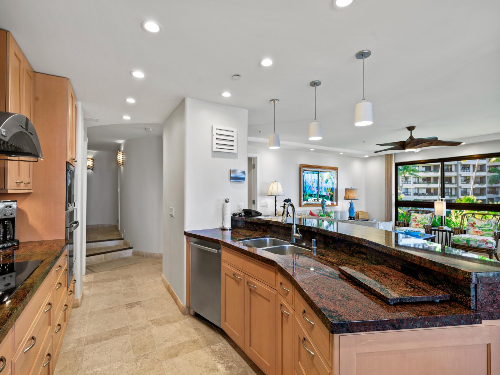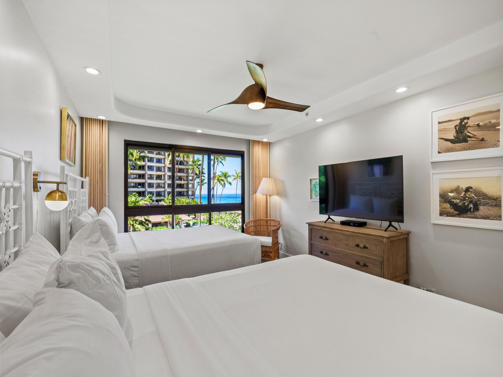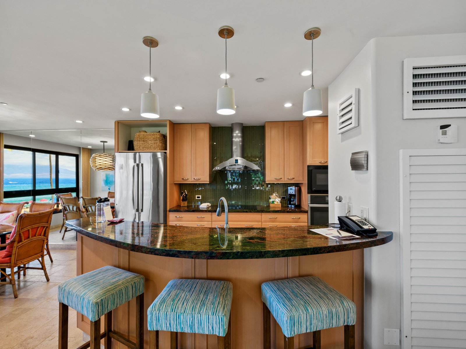 The interior design is contemporary and inviting, accented with vibrant touches inspired by Hawaiian wildlife and natural surroundings. At approximately 1,845 square feet, the open floor plan provides generous space for up to six guests, encouraging comfort and connection. The seamless layout allows ocean views to remain a constant presence throughout the living, dining, and kitchen areas.