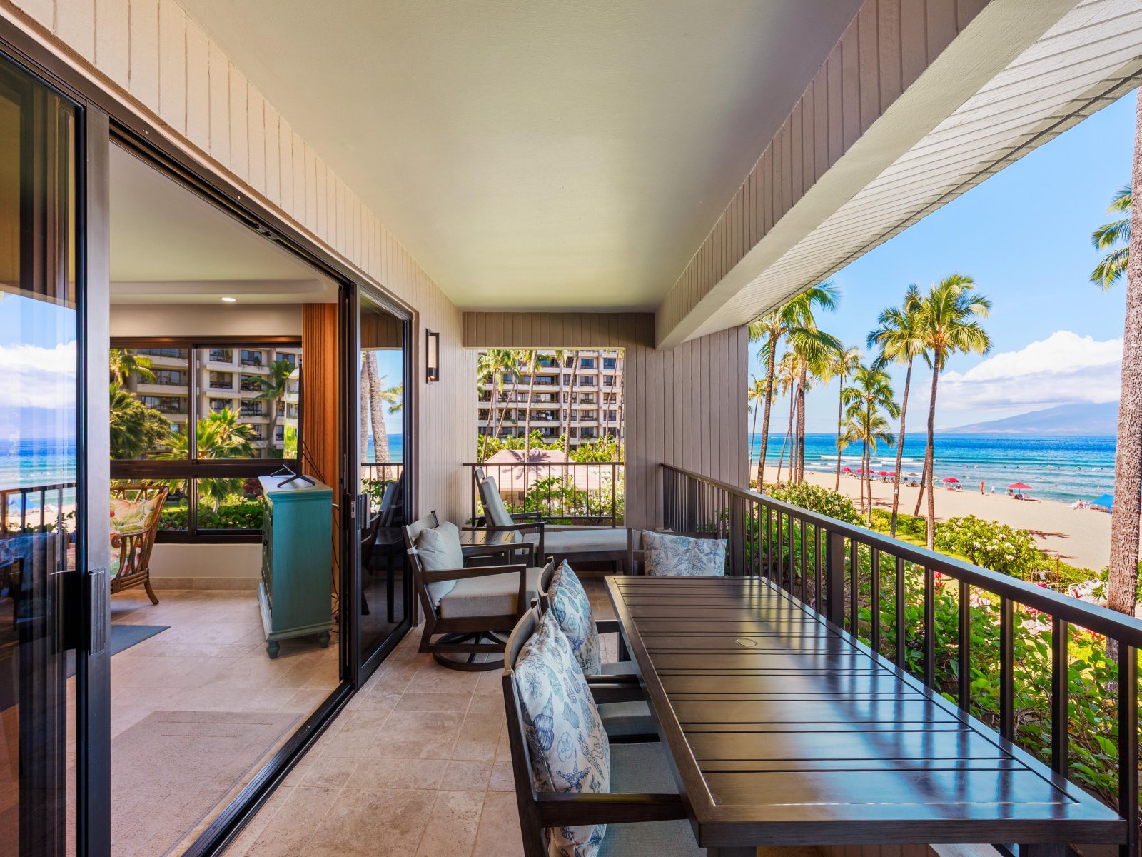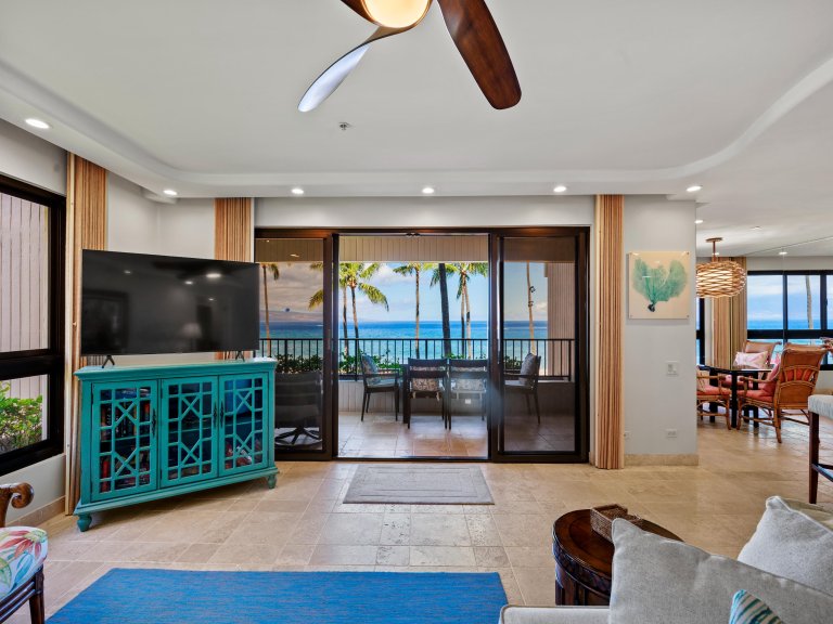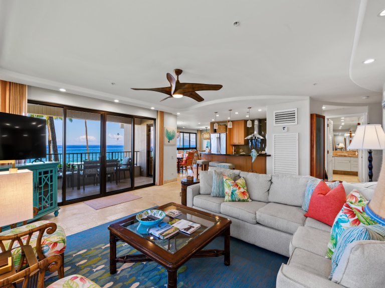 The oceanfront lanai extends the living space outdoors, offering an ideal vantage point over Maui’s coastline.