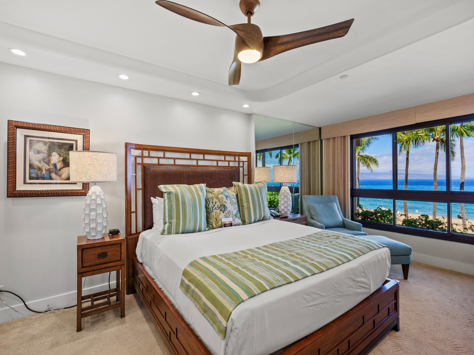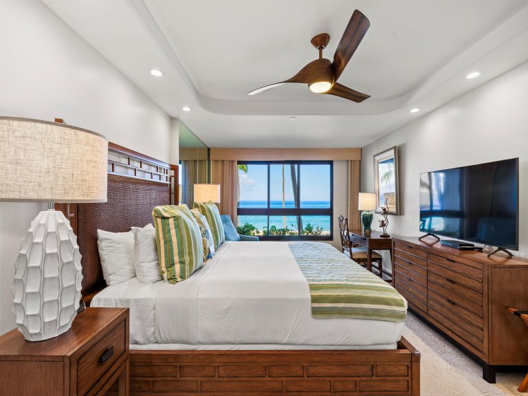 Bed: California King • En-Suite Bath with Shower and Dual Vanity • Ceiling Fan • TV • Ocean View