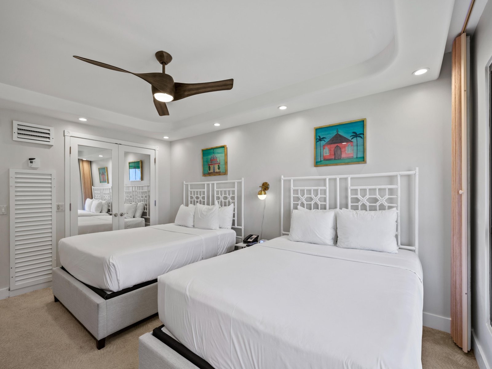 2 Bed: Queen Beds • En-Suite Bath * • Ceiling Fan • TV