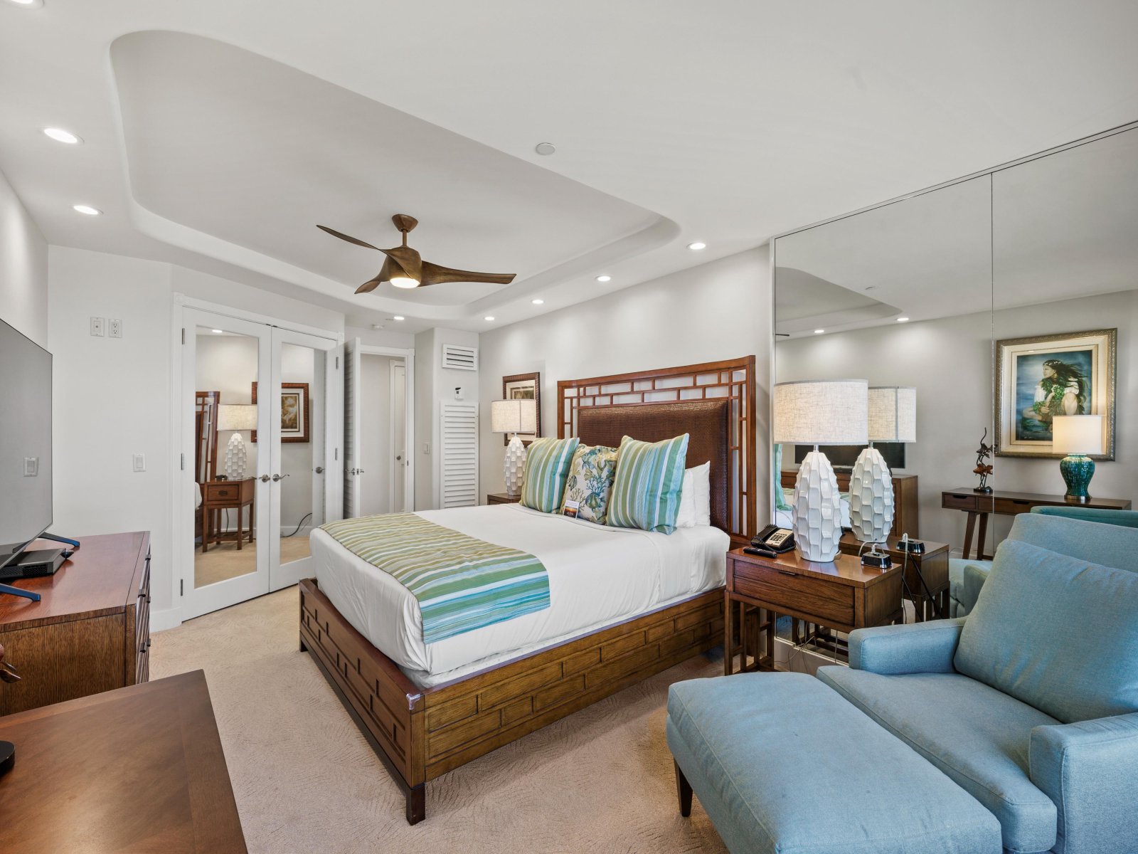 - Oceanfront primary bedroom with California king bed, white leather lounger, flat-screen television, and mirrored accent wall