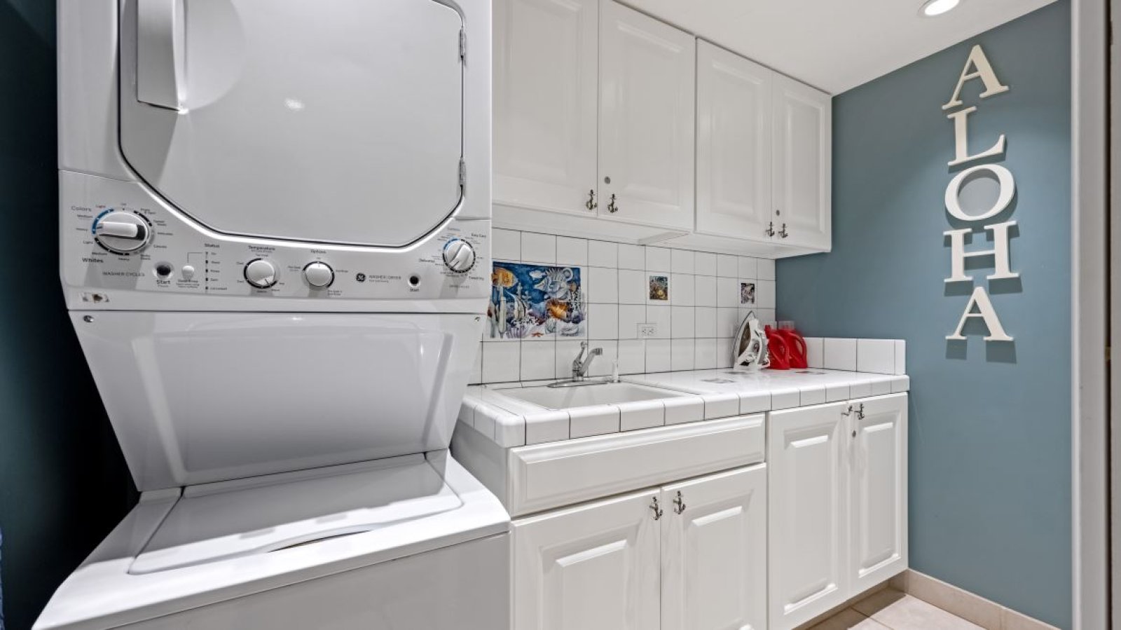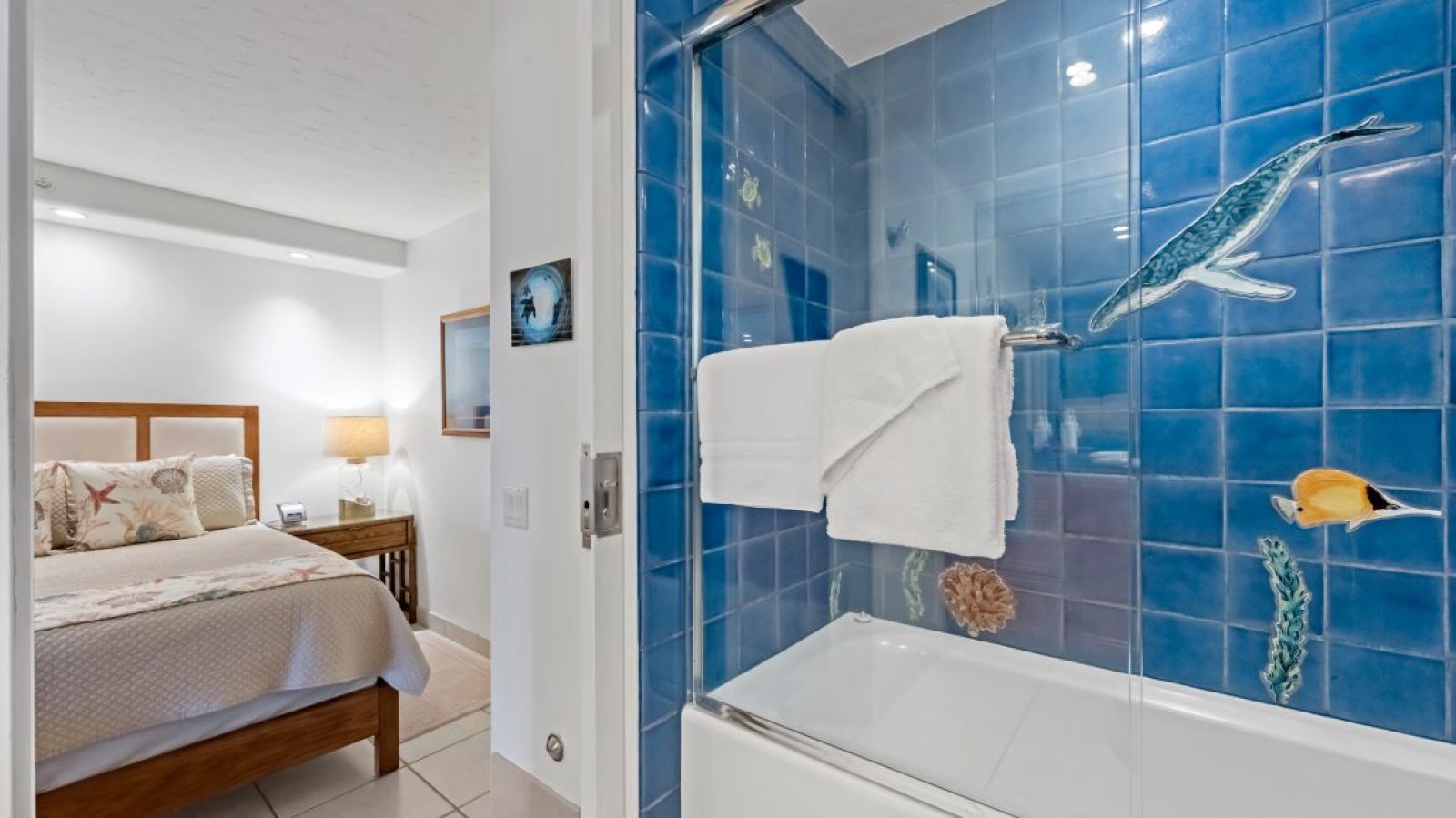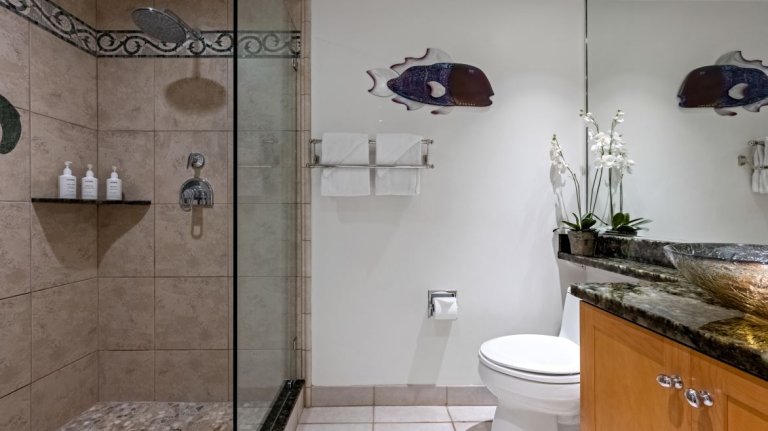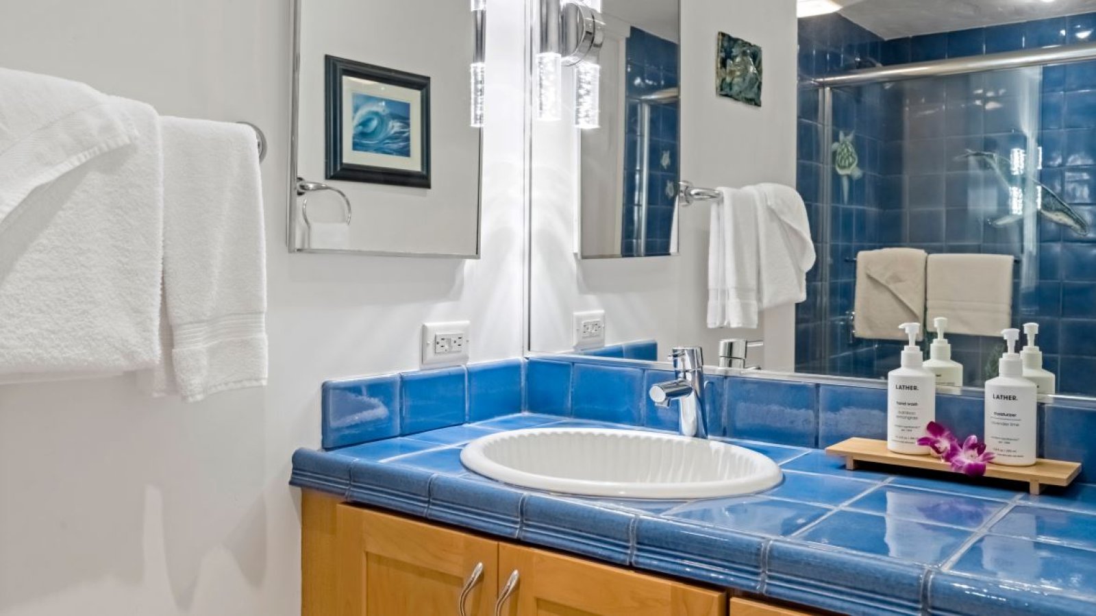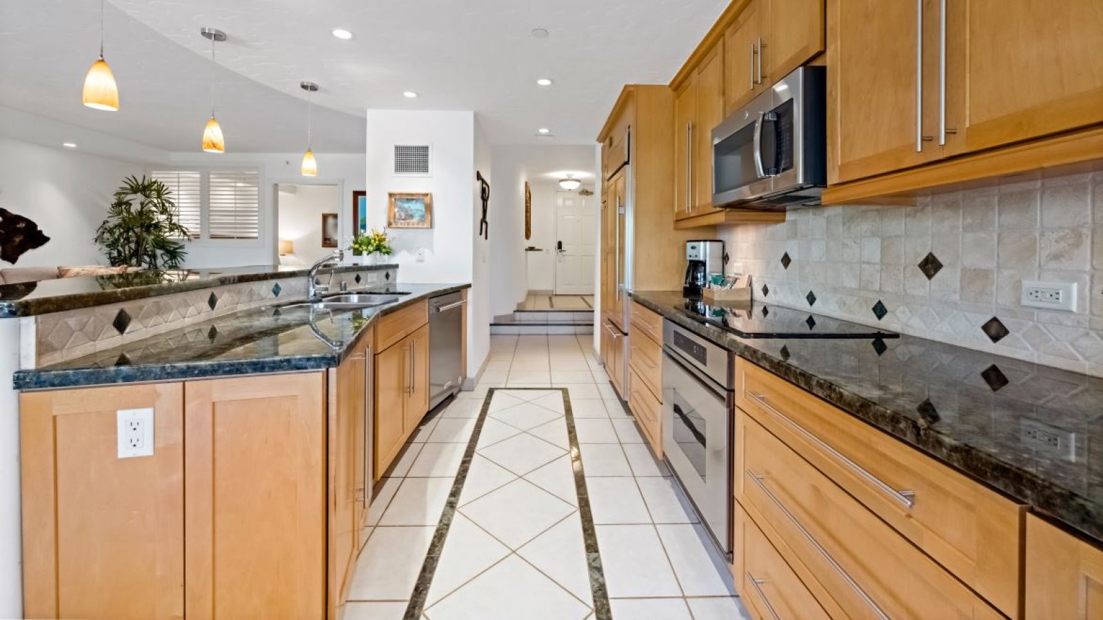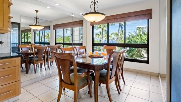 The fully equipped gourmet kitchen features granite countertops, stainless steel appliances, and an island with bar seating for two. The open layout allows guests to remain connected while meals are prepared. A separate dining area seats up to six, while the lanai offers outdoor dining for three with ocean views.