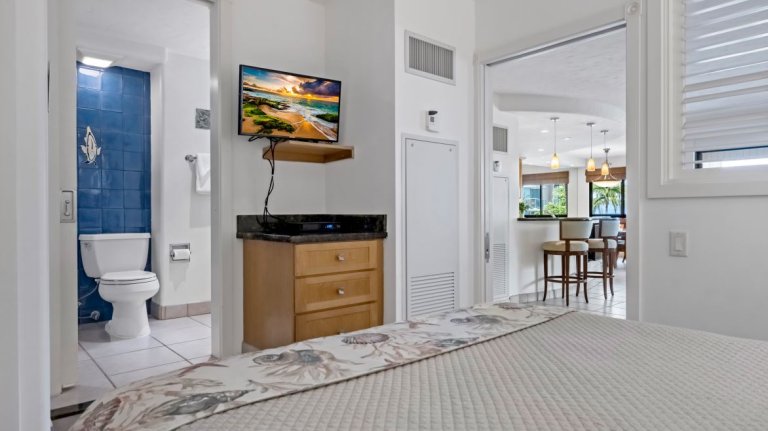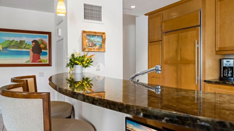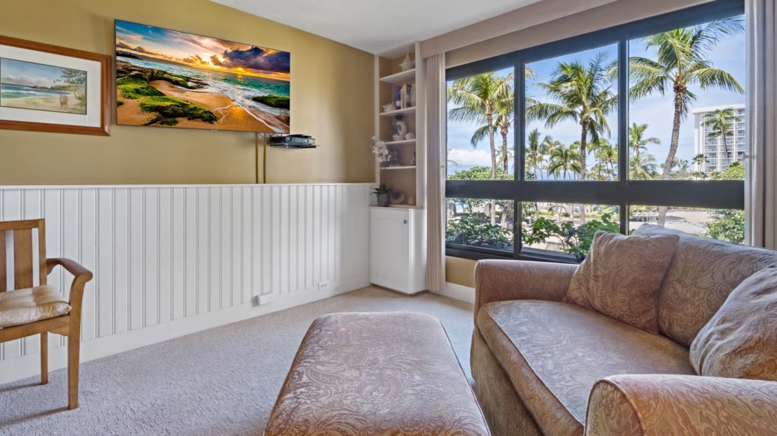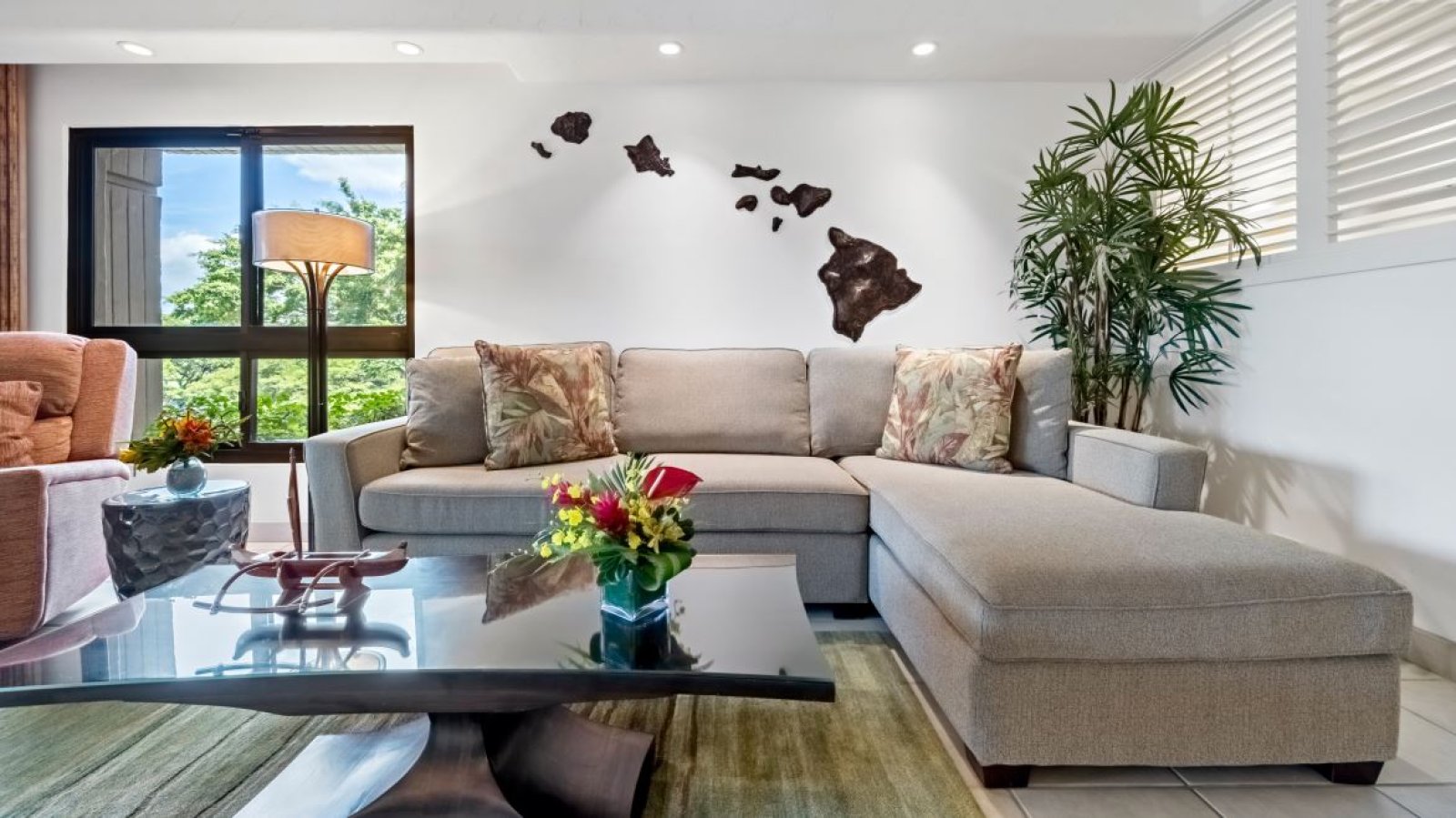 From the private lanai, guests can enjoy pleasant ocean views while taking in the warm Hawaiian air. The contemporary interior design features comfortable seating areas that encourage gathering, balanced by well-defined spaces that allow for quiet moments and privacy.