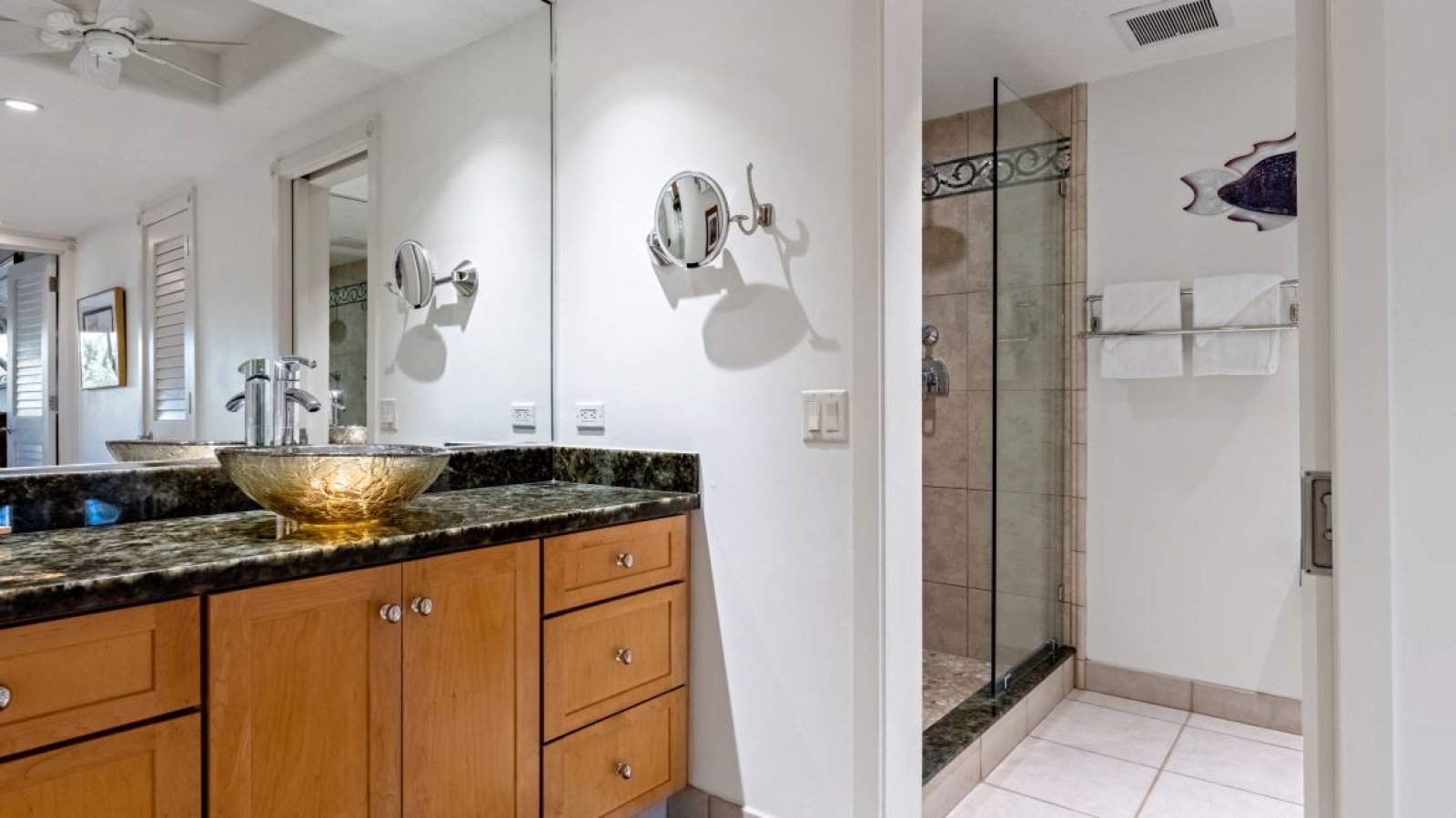 Two full bathrooms, each with a walk-in shower and separate vanity areas
