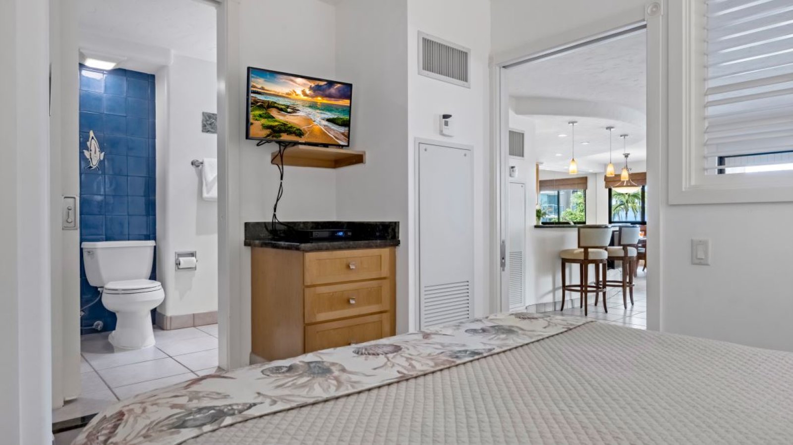 Primary bedroom with king bed, flat-screen television, and additional seating area
