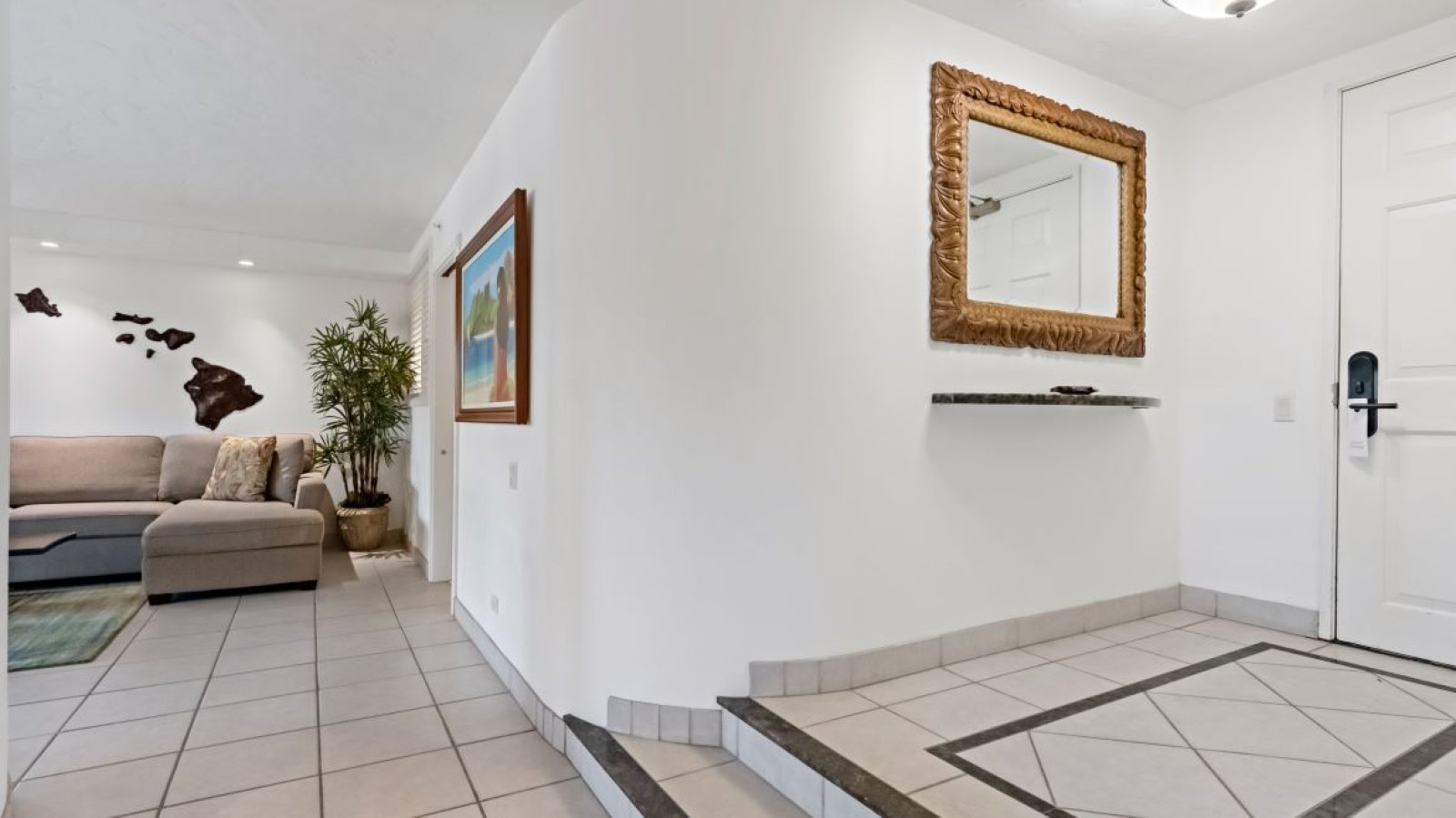 The living area is bright and welcoming, with a seamless flow between the kitchen, dining, and lounge spaces. Thoughtful furnishings and neutral finishes create an easygoing atmosphere that feels both functional and refined. Sliding doors open to the lanai, extending the living space outdoors and offering an inviting place to relax throughout the day.