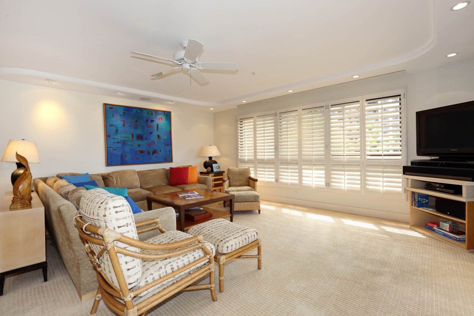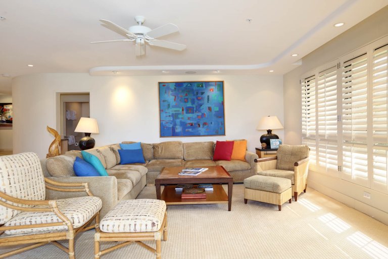 The interior is thoughtfully designed with designer furnishings and curated artwork that reflect a polished island aesthetic. The living room offers both ocean and pool views and features a large sectional sofa paired with lounge chairs and ottomans, creating a comfortable space to unwind. White plantation shutters allow for privacy while still welcoming in natural light and ocean breezes.
