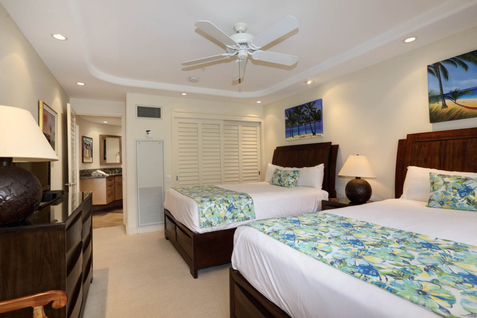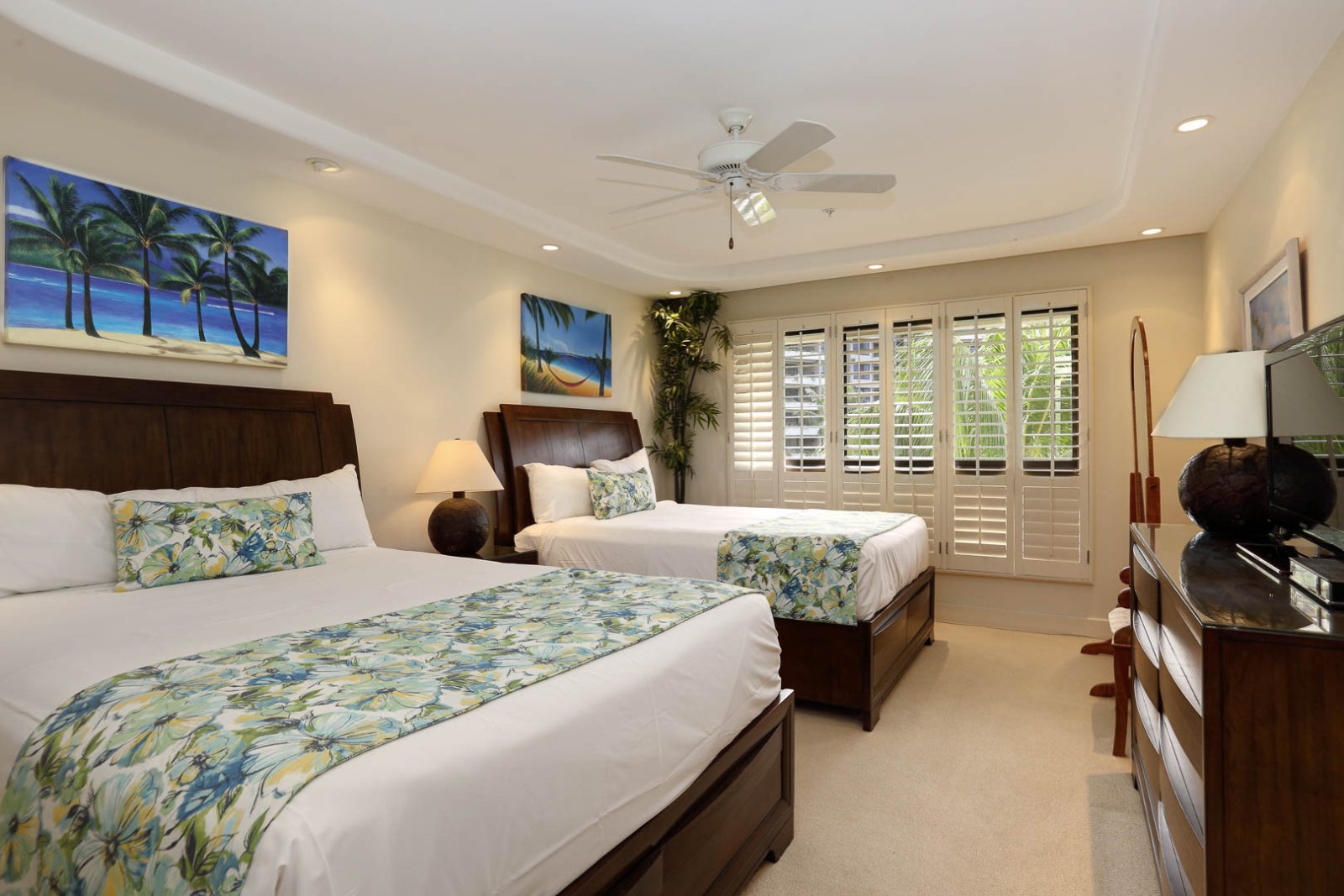 Guest bedroom with two queen sleigh platform beds and tropical-inspired décor