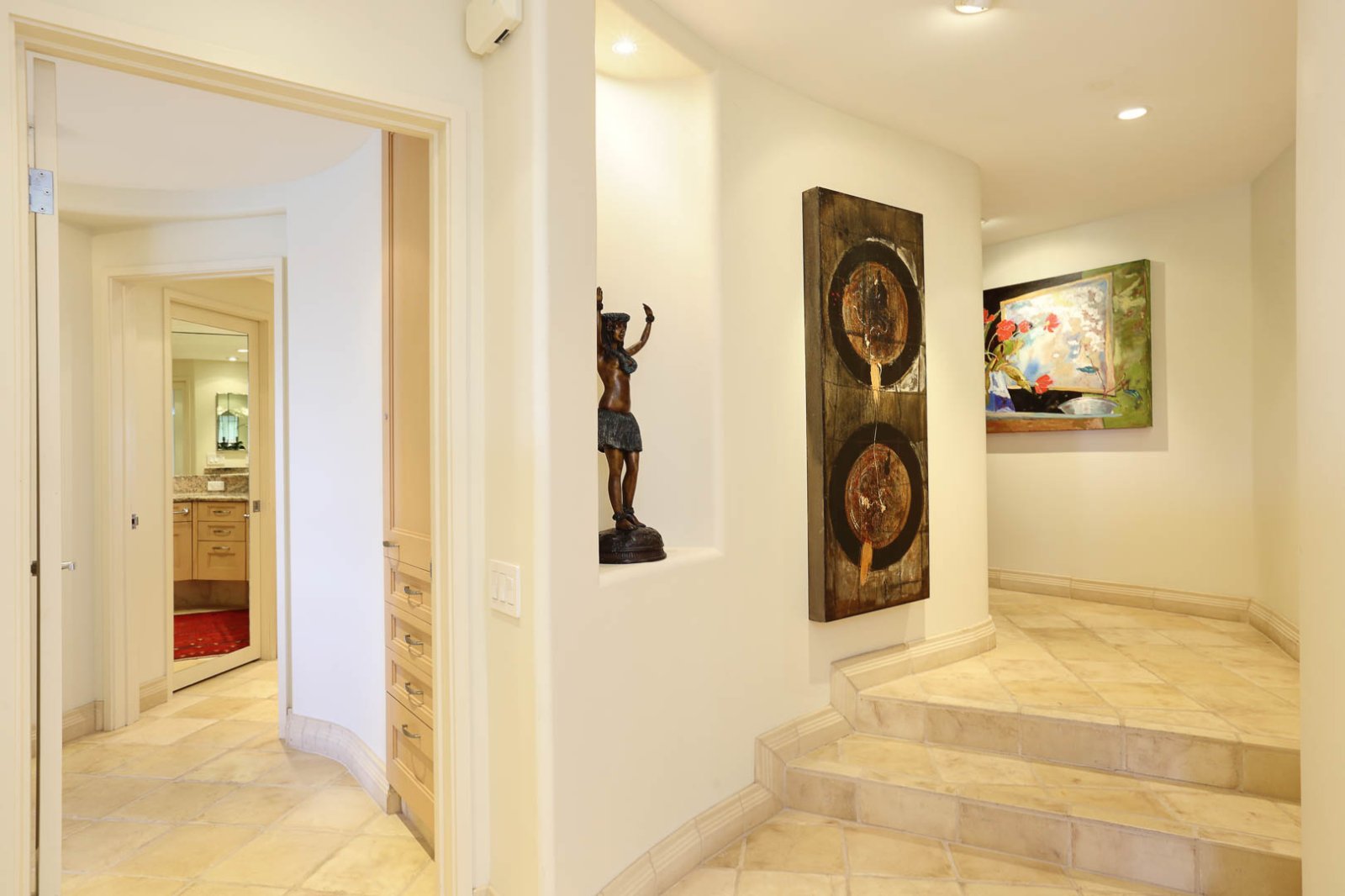 The gourmet kitchen is a standout feature, designed with a distinctive chef-focused layout. The cooktop faces a curved counter, allowing the chef to engage with guests seated at the bar or relaxing in the living area. High-end stainless steel appliances, generous prep space, and ocean views make this kitchen ideal for both cooking and entertaining.