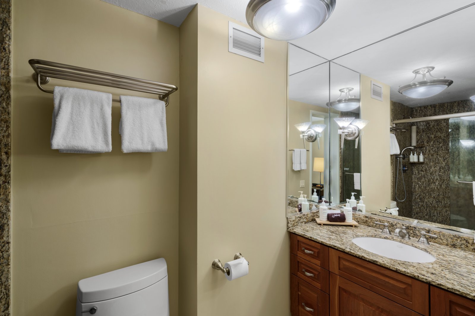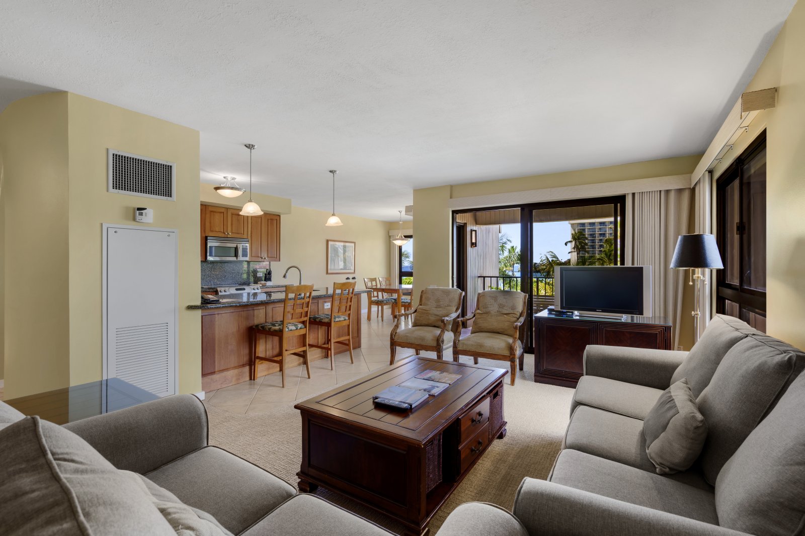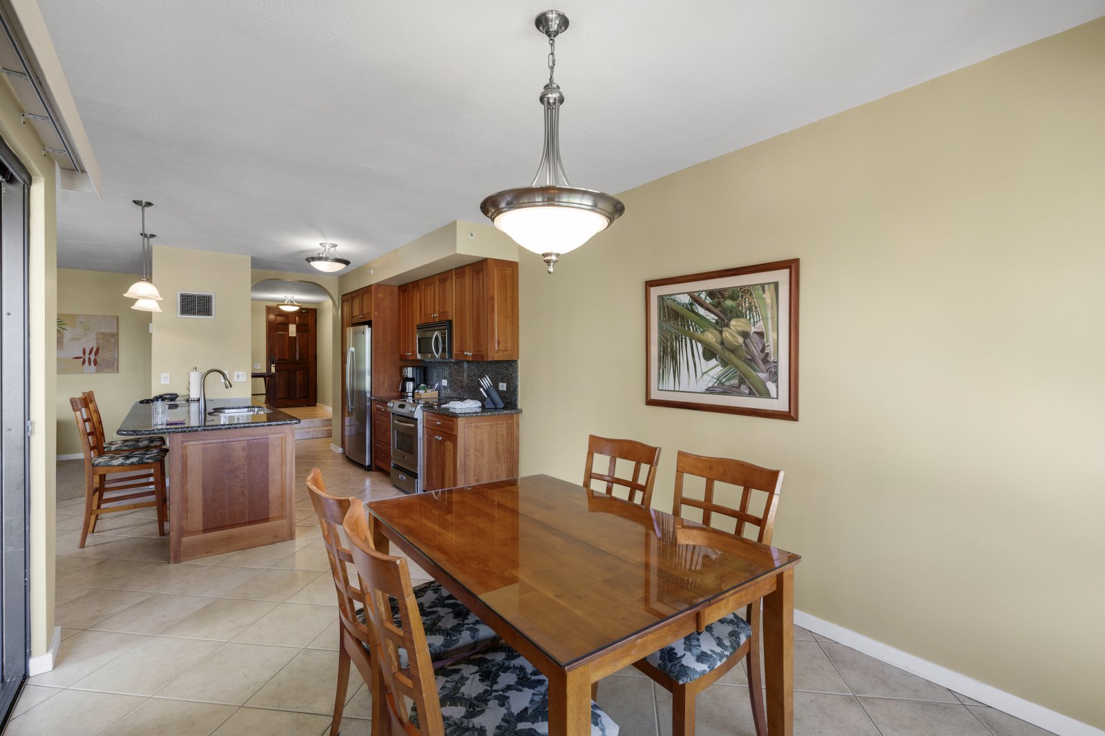 The fully equipped kitchen features rich wood cabinetry, granite countertops, and stainless steel appliances. Bar seating for two connects the kitchen to the living and dining areas, making it easy to socialize while preparing meals. A dining table positioned near the windows allows guests to enjoy meals with scenic views.