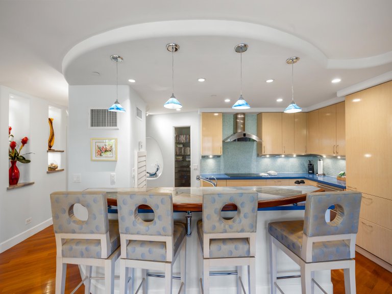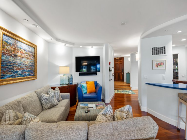 The open and airy living area is designed for both relaxation and gathering. Large windows fill the space with natural light and frame the beautiful coastal scenery, while comfortable furnishings and curated décor create a refined yet welcoming environment. Sliding doors open to the private lanai, extending the living space outdoors.