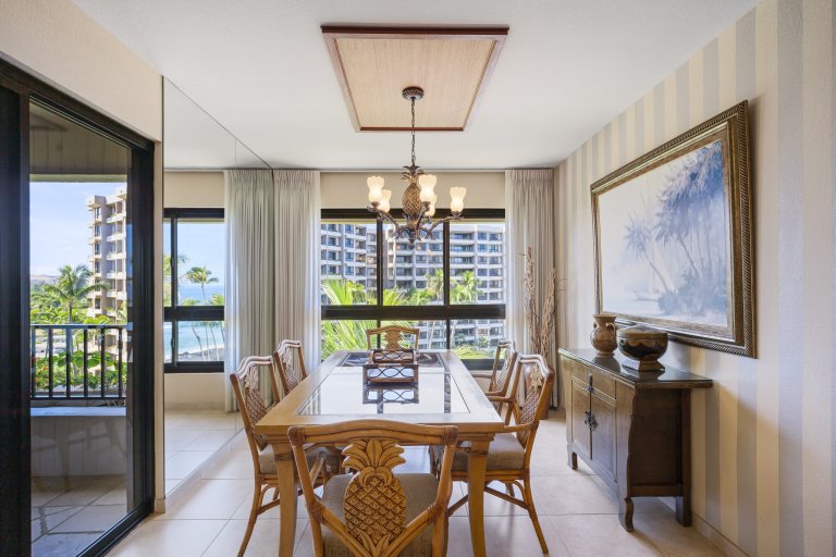 The open living and dining area offers a comfortable setting for gathering and relaxation. Natural light fills the space, while sliding glass doors connect the interior to the lanai, enhancing the flow between indoor and outdoor living. The overall design encourages unhurried living and effortless enjoyment of the island surroundings.