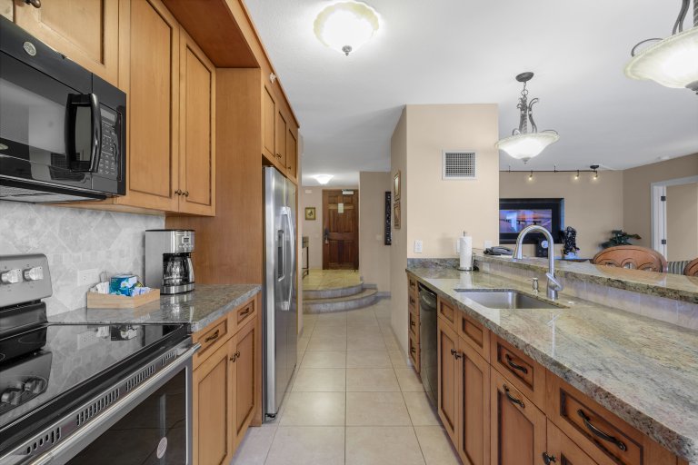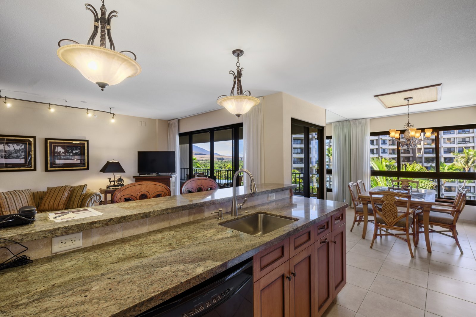 The fully equipped kitchen features granite countertops, stainless steel appliances, and ample storage, making it easy to prepare meals at home. Guests may enjoy casual dining at the breakfast bar, shared meals at the dining table for six, or alfresco dining on the lanai surrounded by tropical scenery.