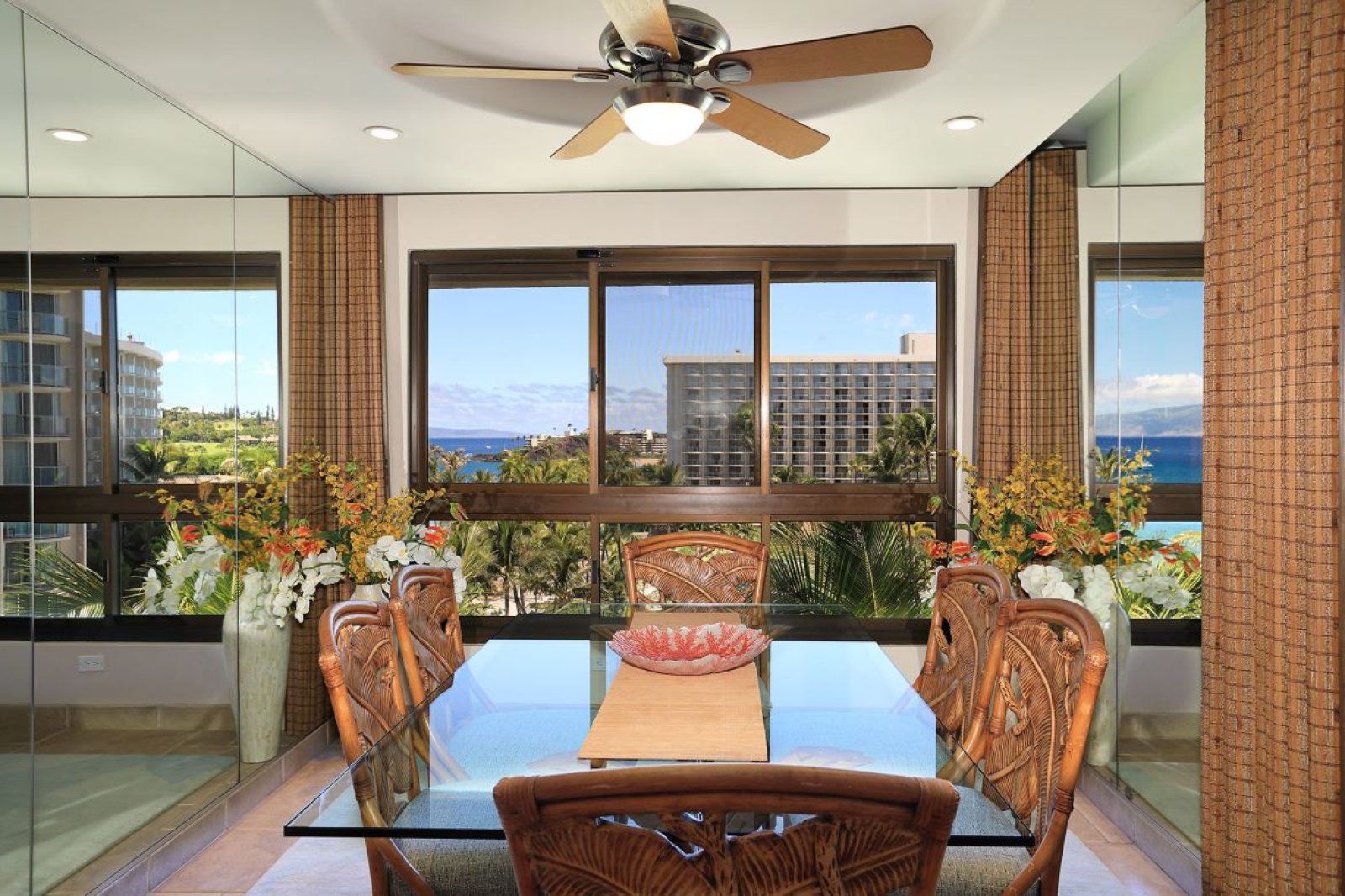 The private oceanview lanai offers a front-row perspective of Maui’s natural beauty, from colorful sunsets to winter whale sightings.• Oceanview lanai with lounge seating and dining table