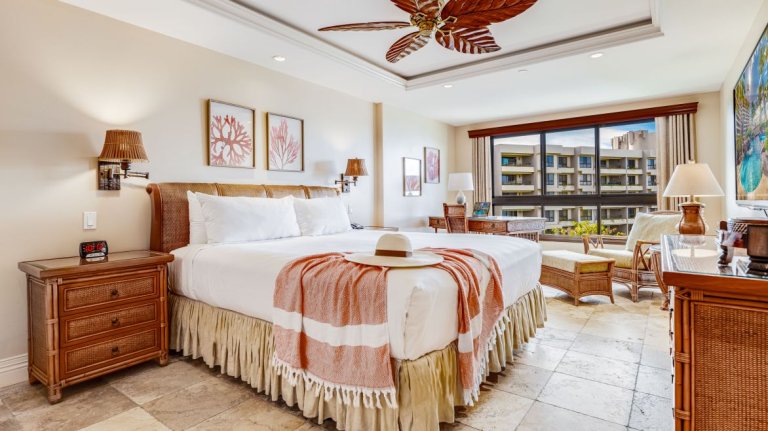 The open living area is designed for comfort and ease, featuring a generous sectional sofa and large windows that frame ocean and resort views. Sliding glass doors provide direct access to the private lanai, extending the living space outdoors and enhancing the connection to the surrounding tropical landscape. The enclosed den adds privacy and flexibility for additional guests.Sleeping Accommodations | Sleeps Up to 6