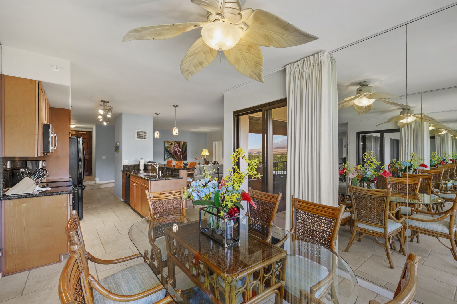 The fully equipped kitchen is thoughtfully designed to keep guests connected while preparing meals. Black appliances, granite countertops, and bar seating for three create a welcoming space for casual dining or conversation. A dining table seating six offers a comfortable setting for shared meals, while the lanai provides an inviting outdoor dining option.Outdoor Living