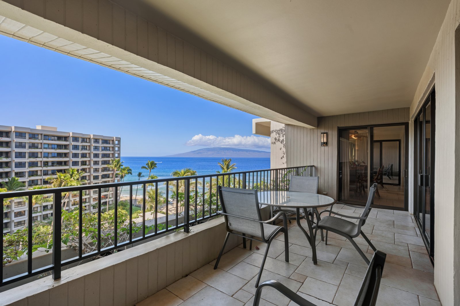 The private lanai extends the living space outdoors, offering views of the ocean and resort grounds.• Oceanview lanai with lounge seating and dining table