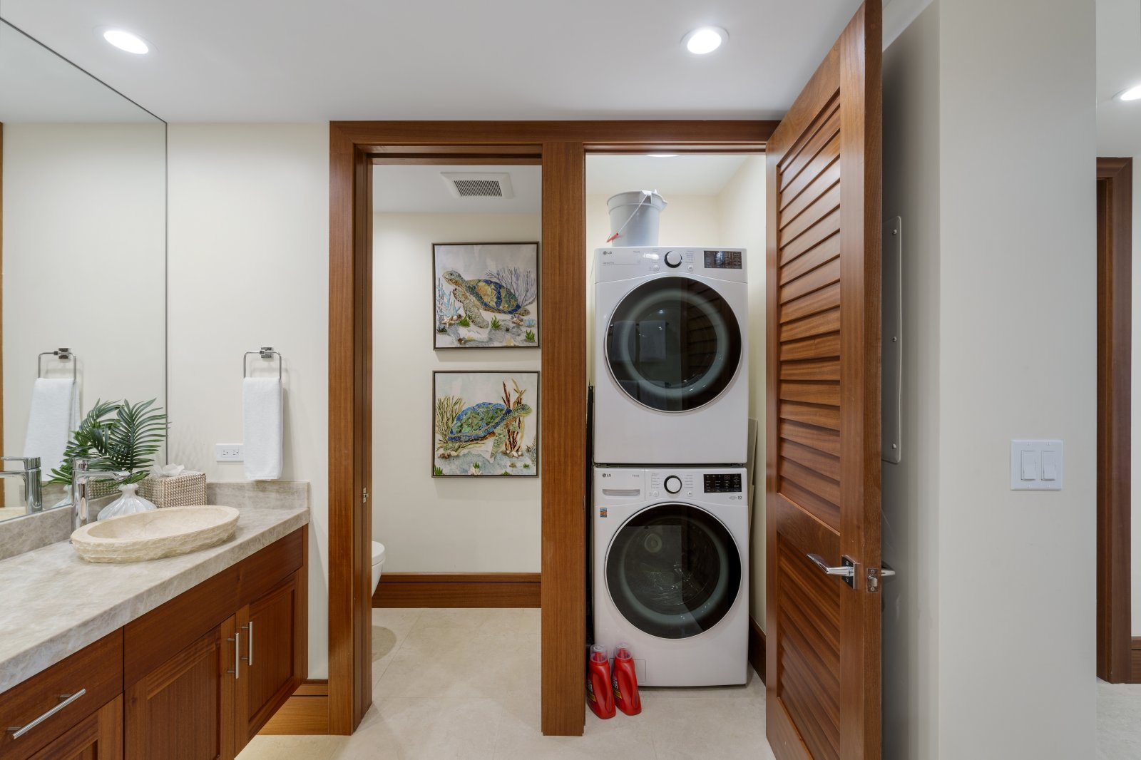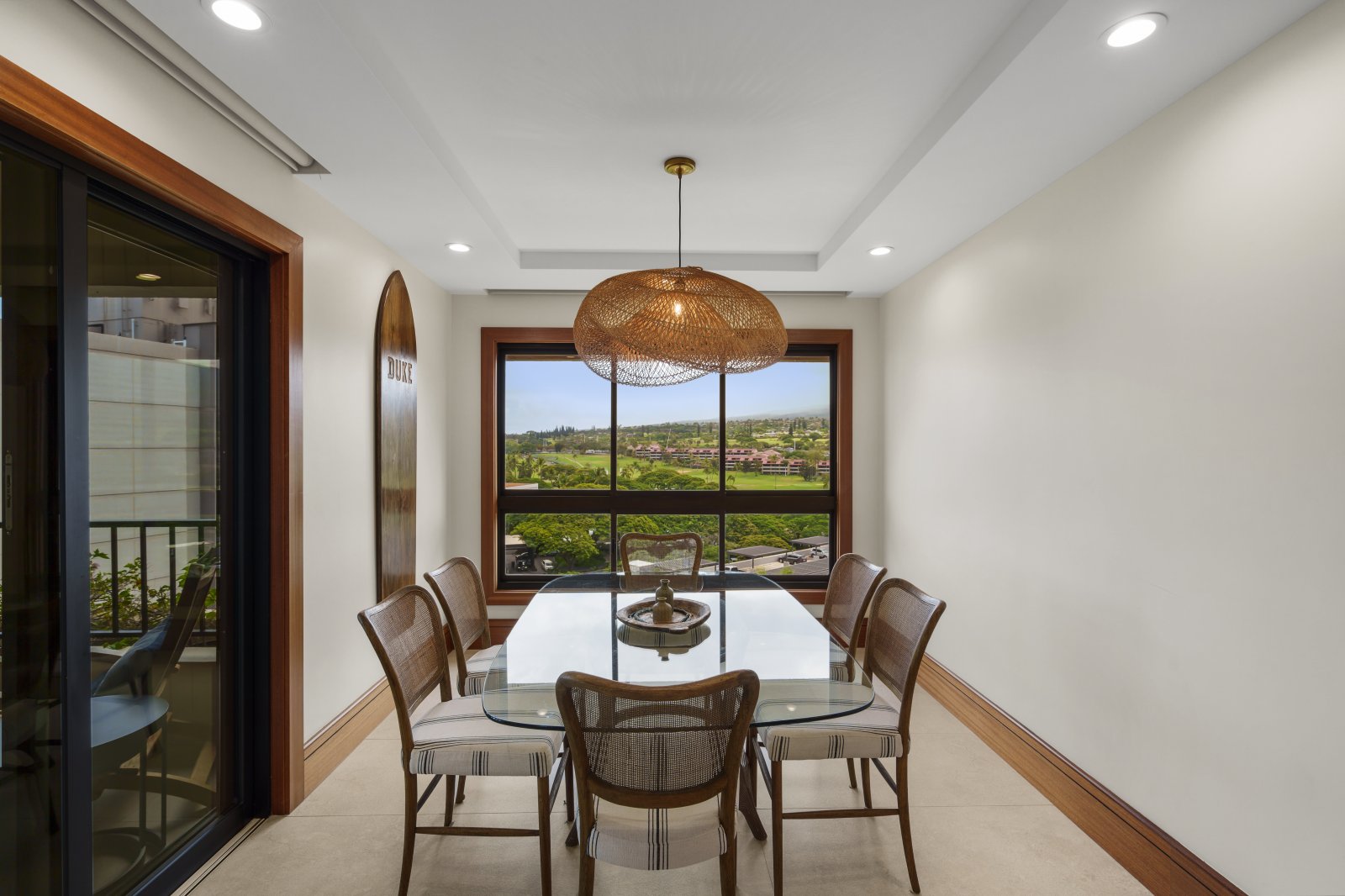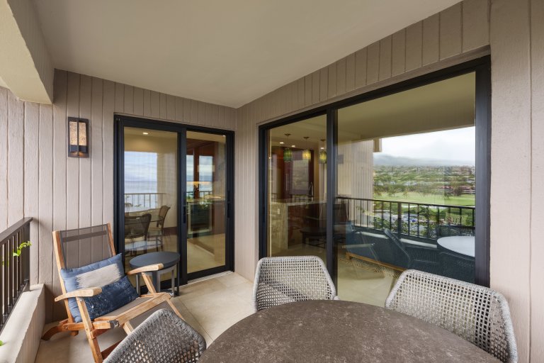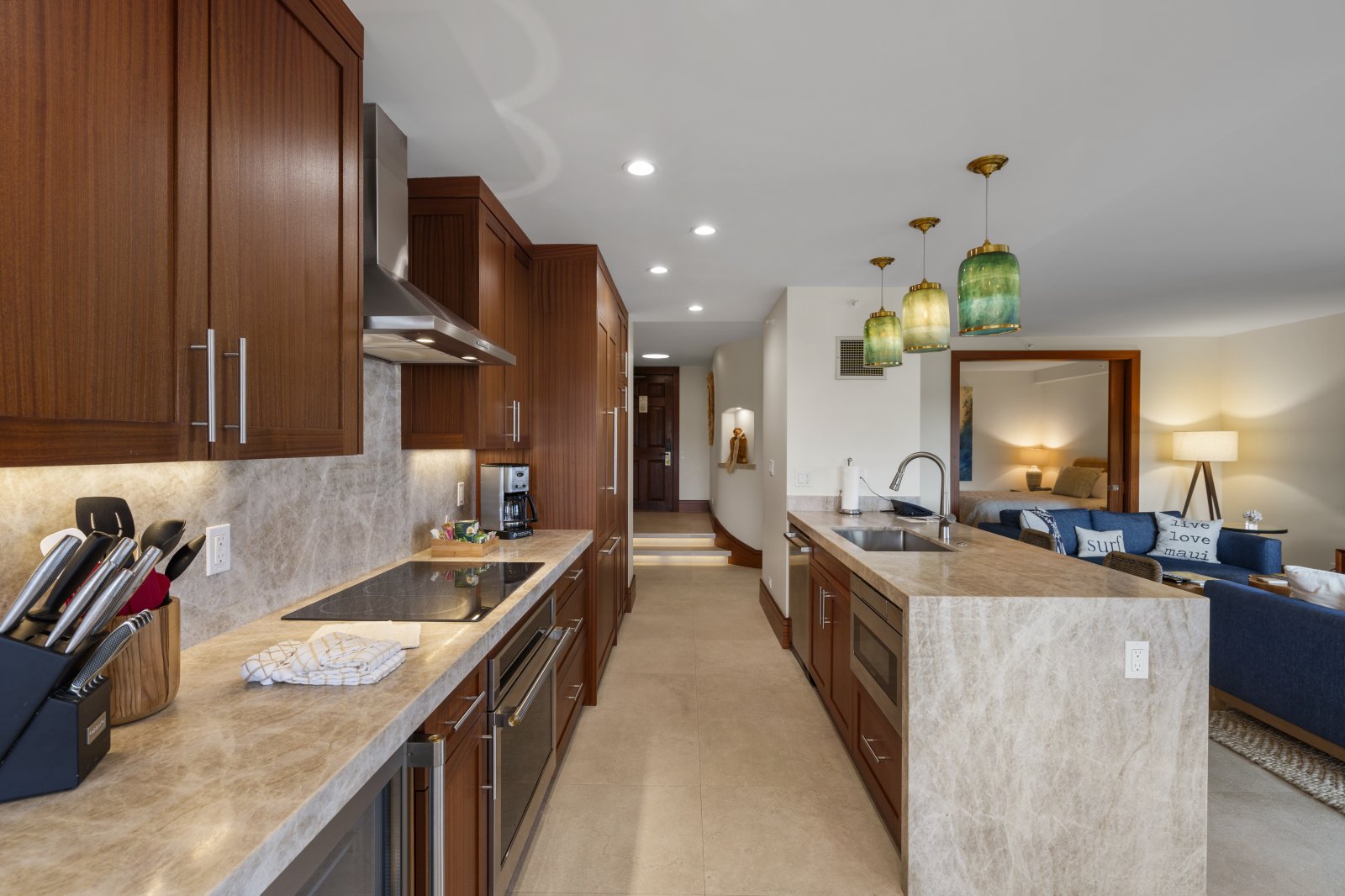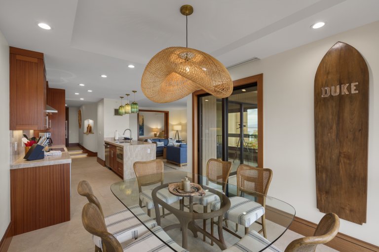 The fully updated gourmet kitchen is both functional and visually striking. Light stone countertops provide a clean contrast to the cherry wood cabinetry, while high-end stainless steel appliances support effortless meal preparation. Guests may dine indoors at the table seating six or step onto the lanai for open-air dining with ocean views and cooling trade winds.Outdoor Living