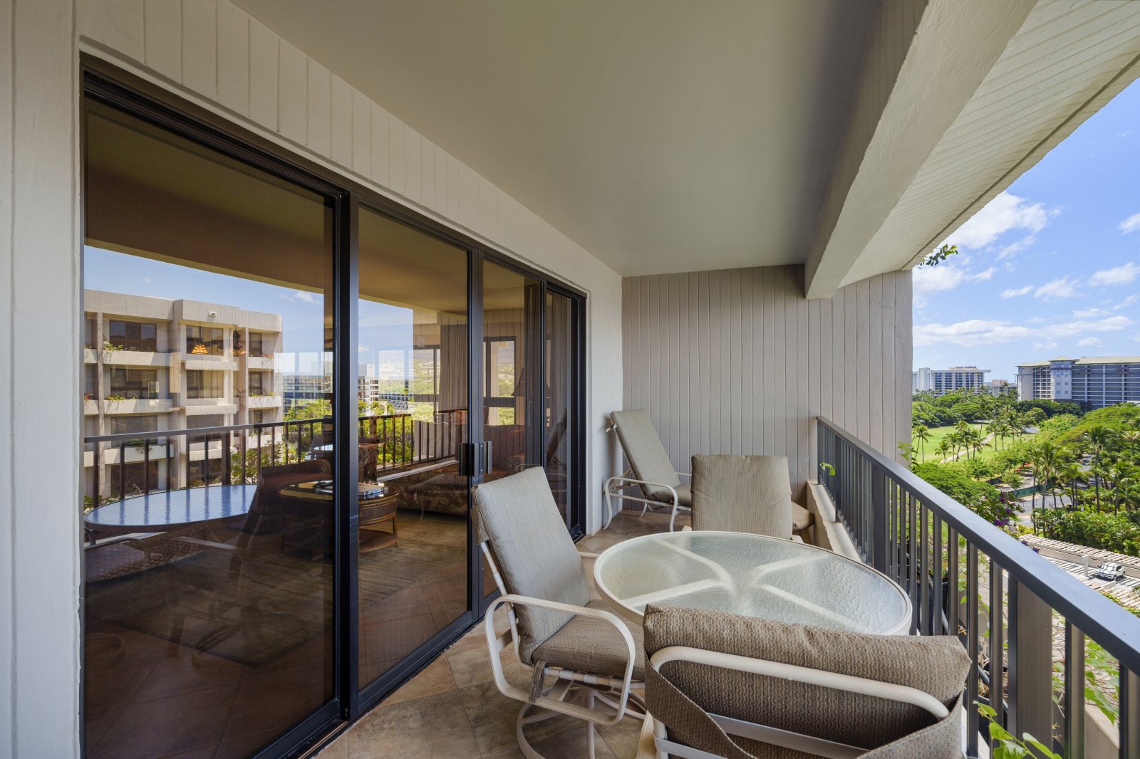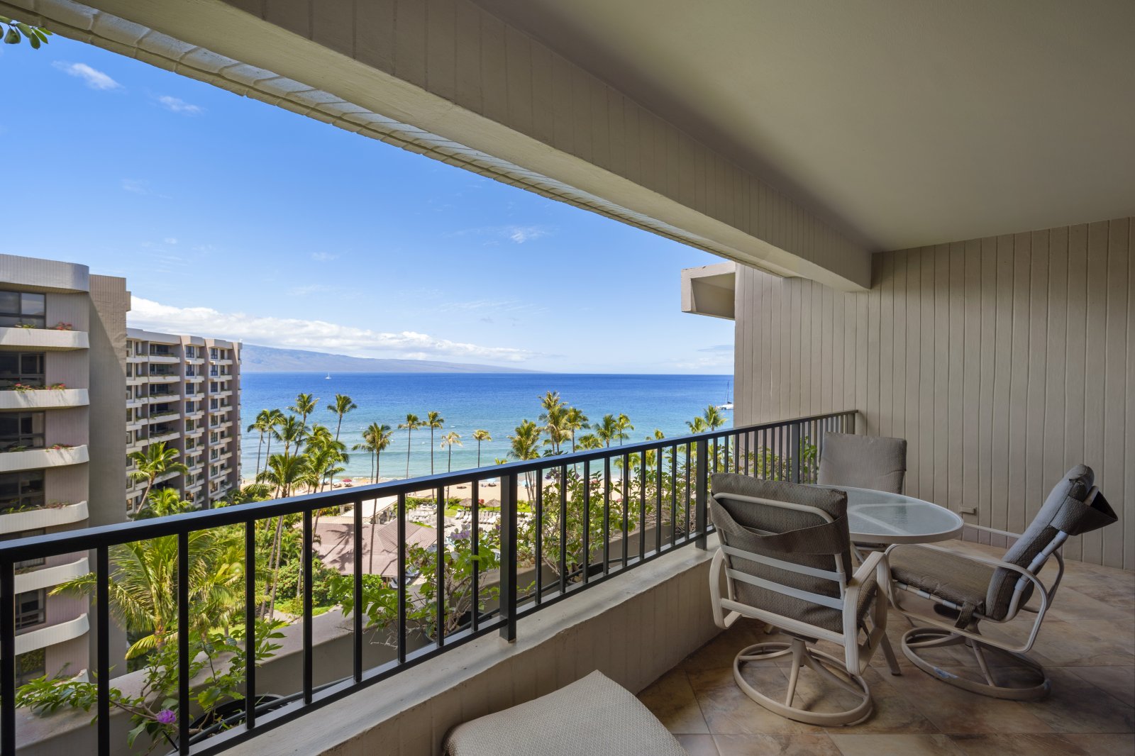 The private oceanfront lanai offers an inviting space to relax and take in the surrounding scenery. With lounge seating and a dining table, it is ideal for morning coffee, afternoon relaxation, or sunset evenings overlooking Kaʻanapali Beach. Guests enjoy easy access to the resort’s pools, tennis courts, and barbecue stations just steps away.Residence Details