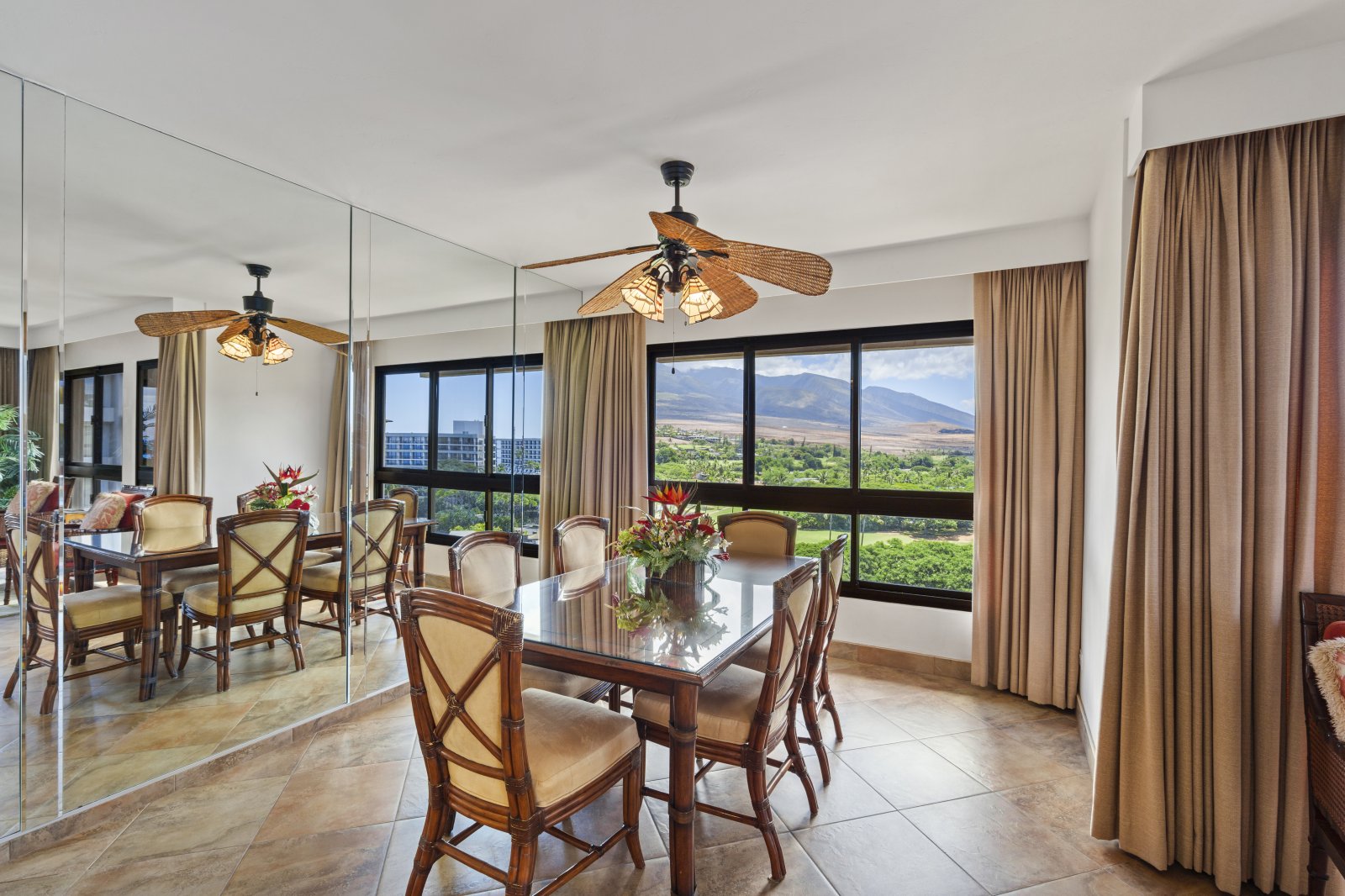 The open-concept living and dining areas are designed to maximize space and natural light. Large windows showcase ocean and resort views while inviting gentle trade winds throughout the home. Comfortable seating, a welcoming lounge layout, and thoughtful finishes create a space well suited for gathering, entertaining, or quiet evenings indoors.Sleeping Accommodations | Up to 6 Guests