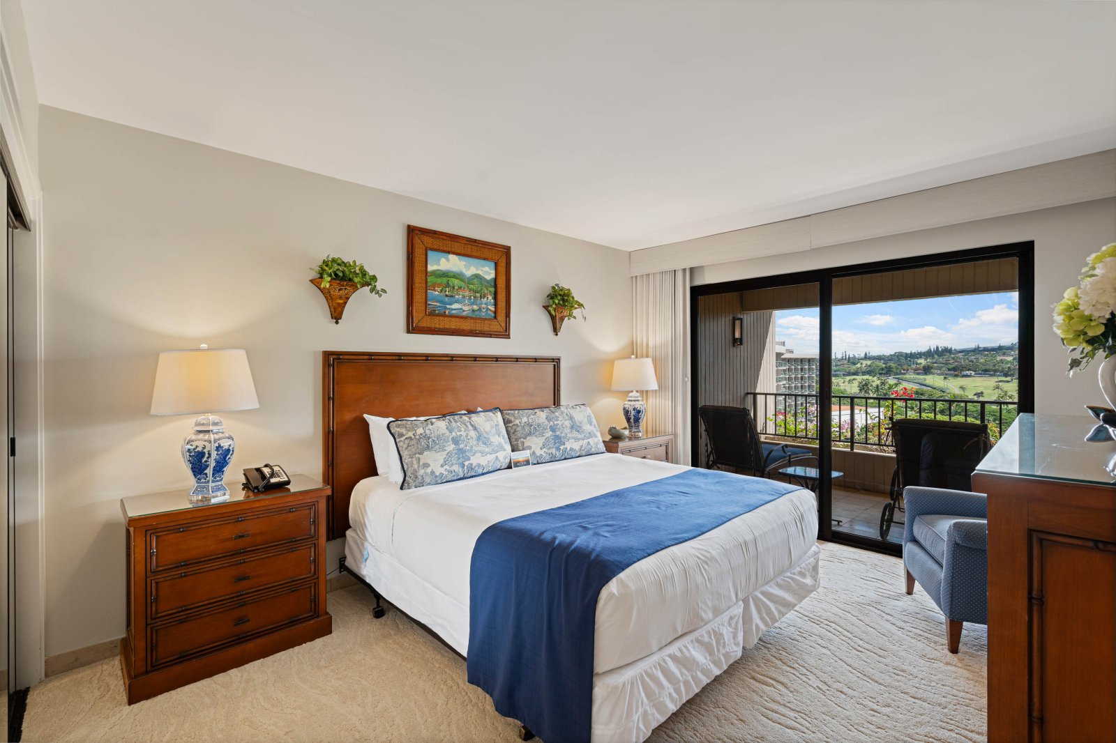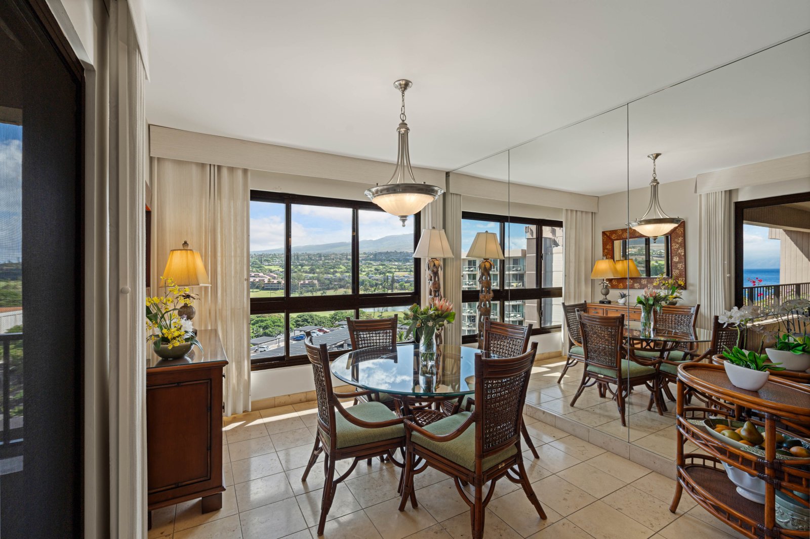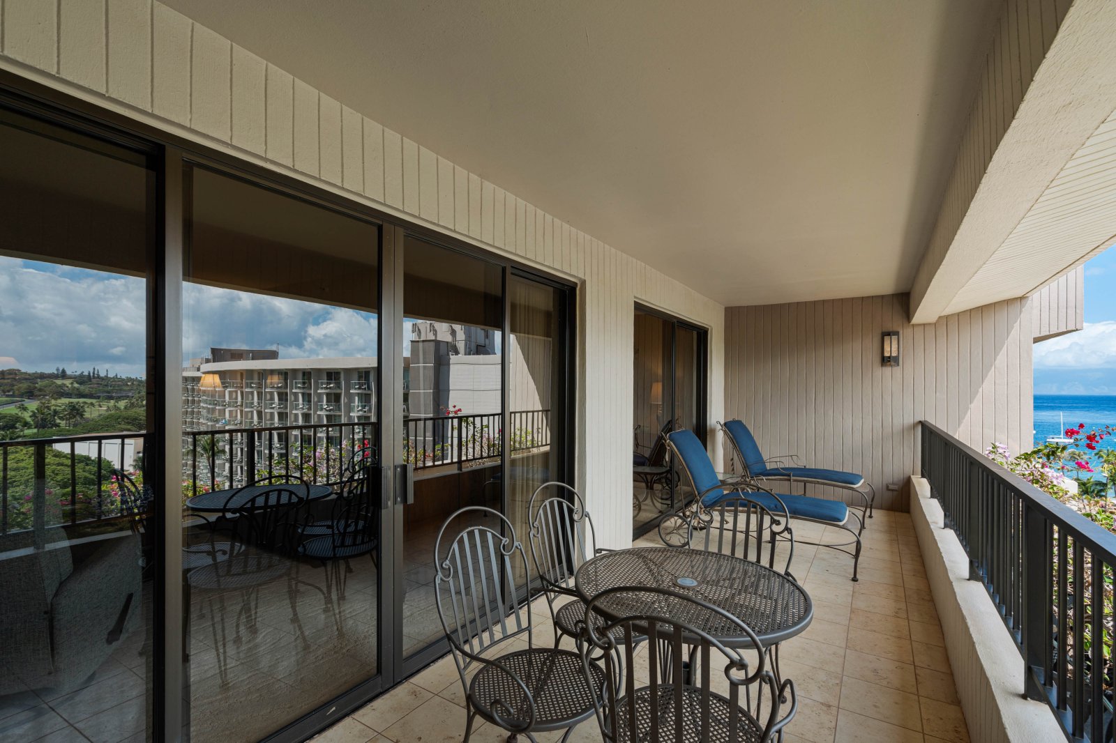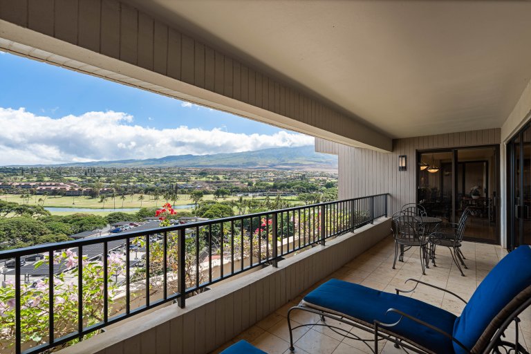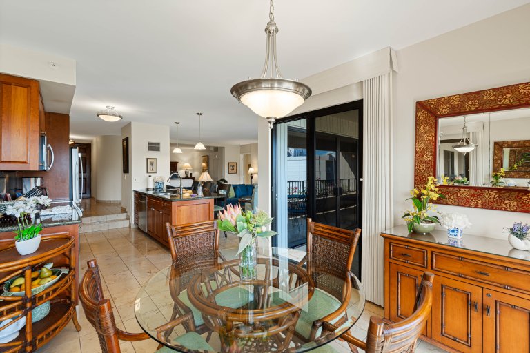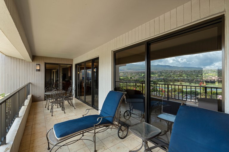 The private lanai is an inviting extension of the living space, furnished with lounge seating and a dining table. Surrounded by mountain and garden views with a glimpse of the ocean, it is an ideal setting for morning coffee, afternoon relaxation, or sunset evenings. Guests enjoy convenient access to the resort’s pools, tennis courts, and barbecue stations.Residence Details