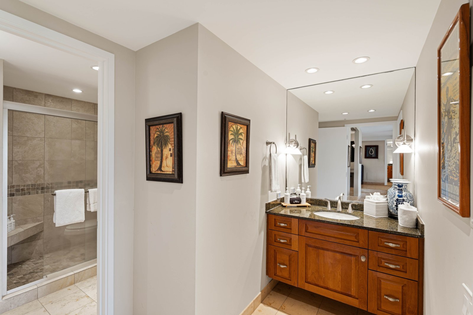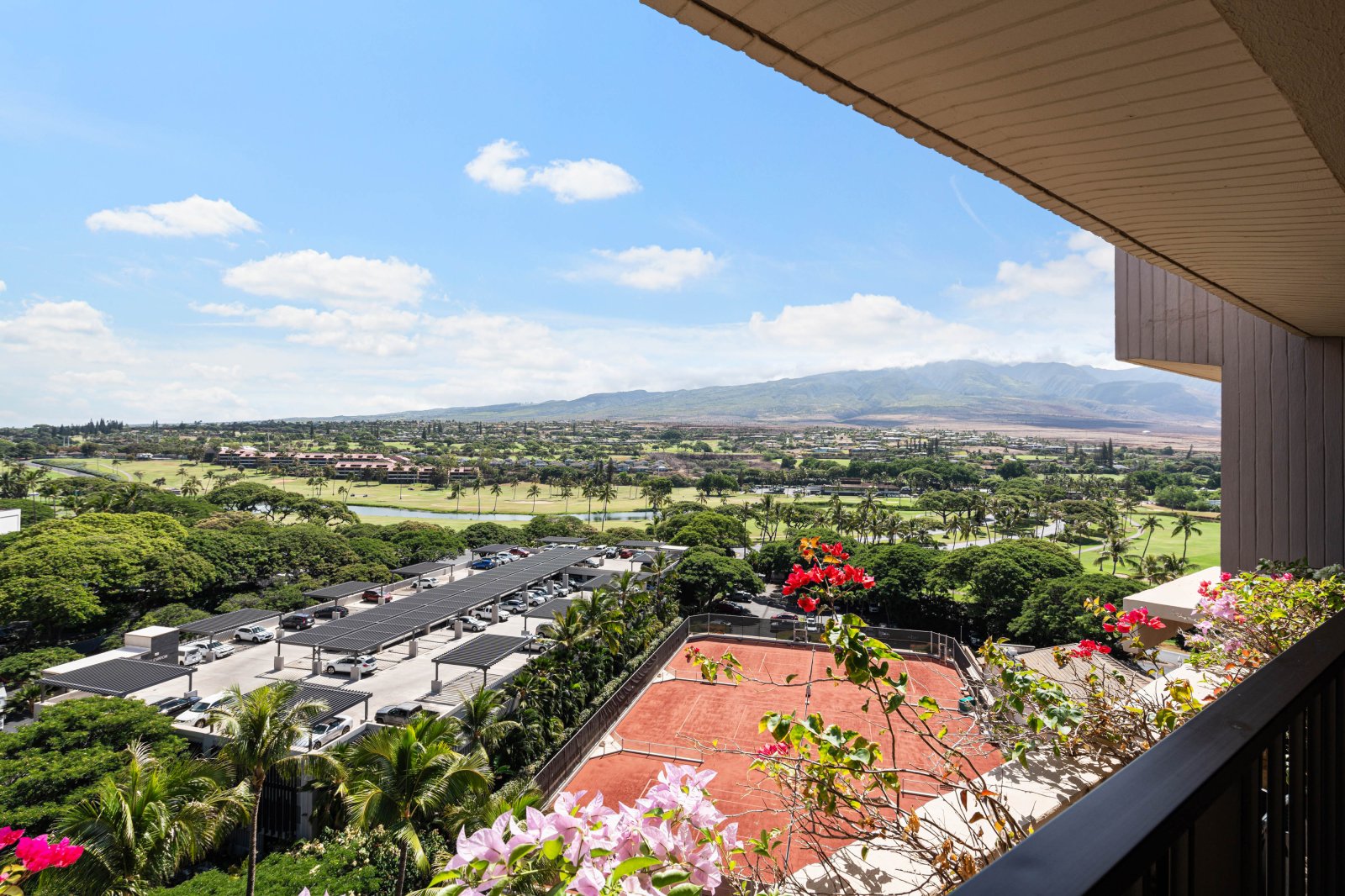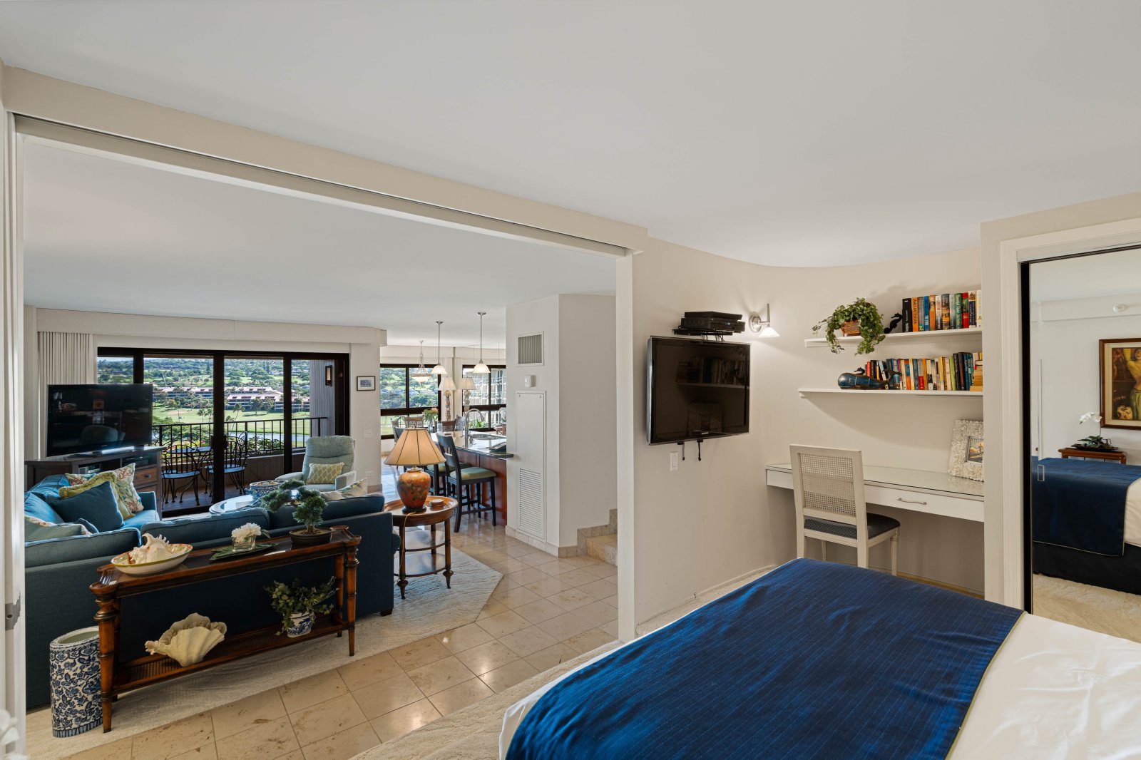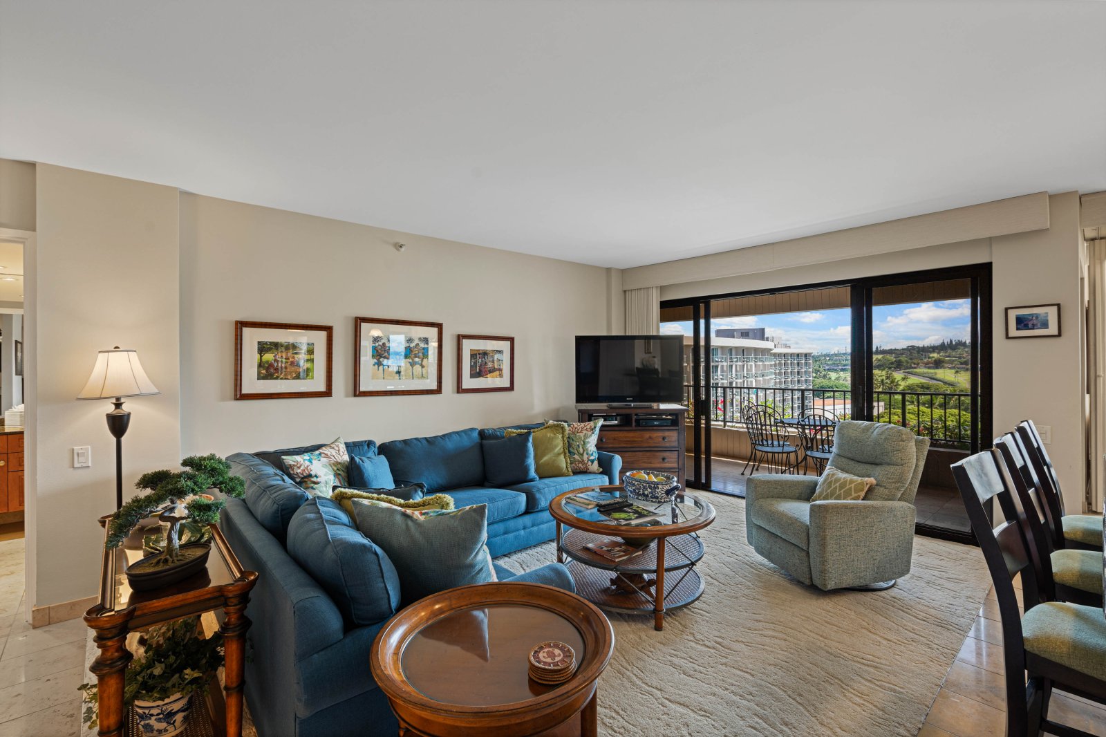 The private lanai is an inviting extension of the living space, furnished with lounge seating and a dining table. Surrounded by mountain and garden views with a glimpse of the ocean, it is an ideal setting for morning coffee, afternoon relaxation, or sunset evenings. Guests enjoy convenient access to the resort’s pools, tennis courts, and barbecue stations.Residence Details