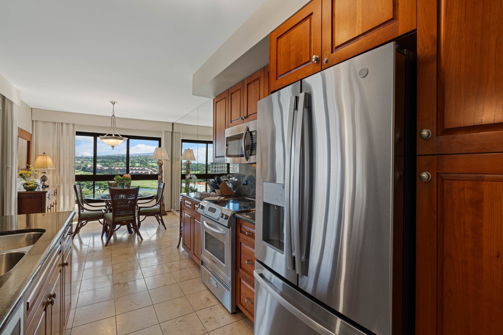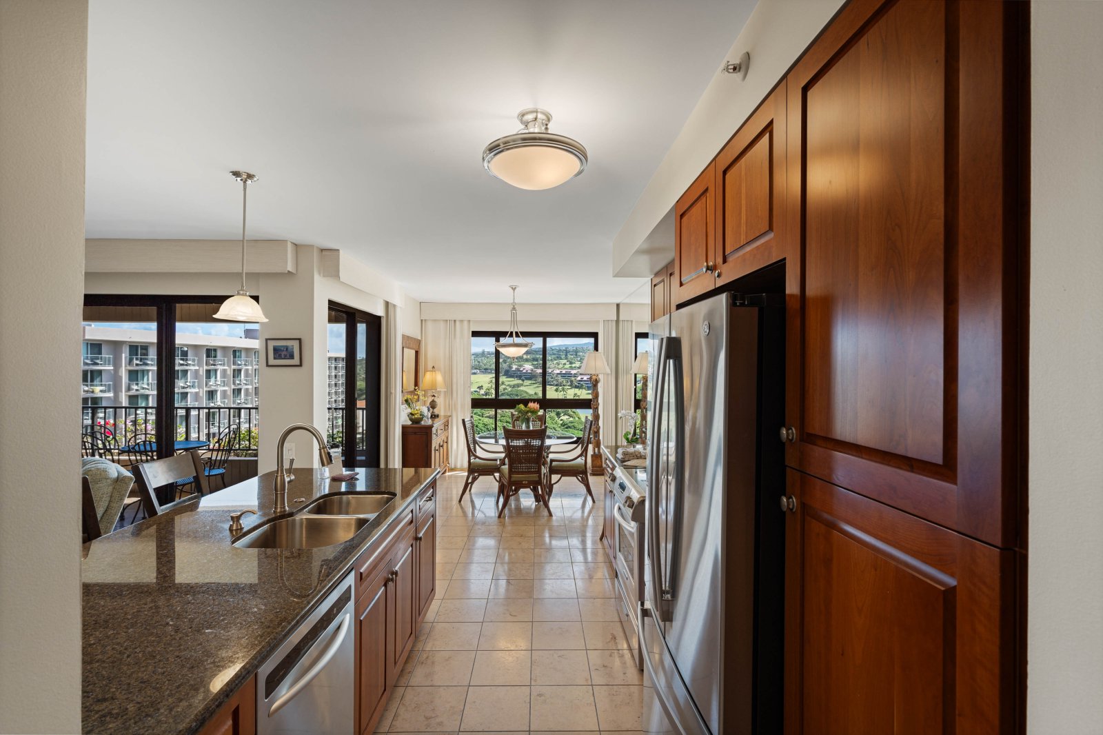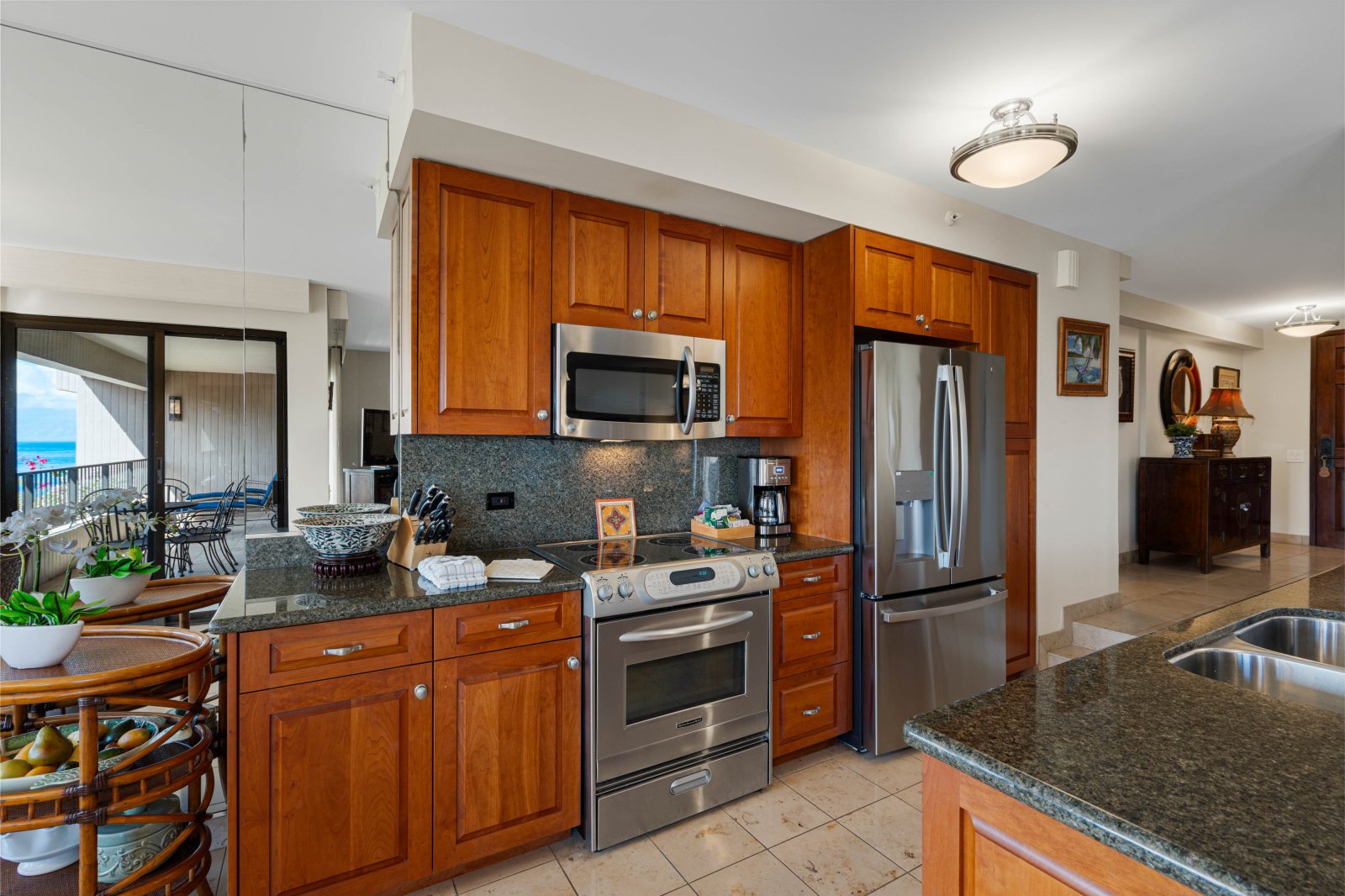 The spacious gourmet kitchen is fully stocked and equipped with high-end stainless steel appliances, generous counter space, and ample cabinetry. Whether preparing island-inspired meals or casual snacks, the kitchen supports effortless entertaining and everyday comfort.Outdoor Living