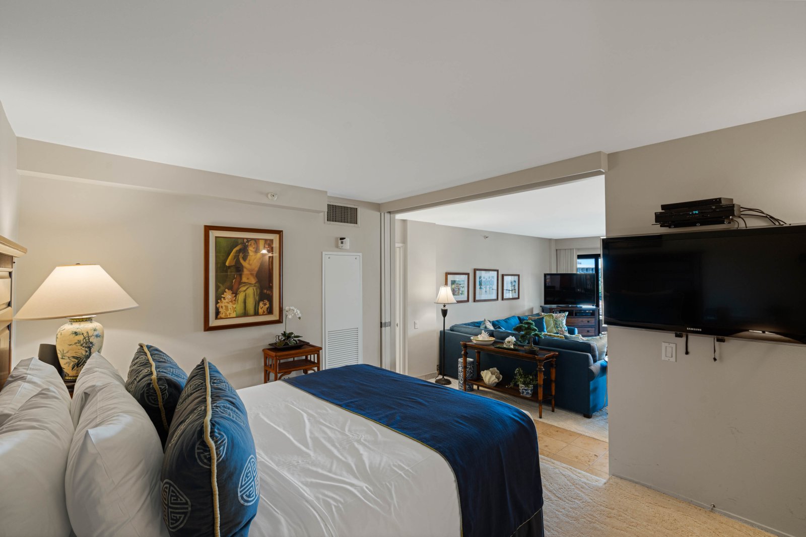 Bed: California King • En-Suite Bath with Walk-In Shower • TV • Additional Seating