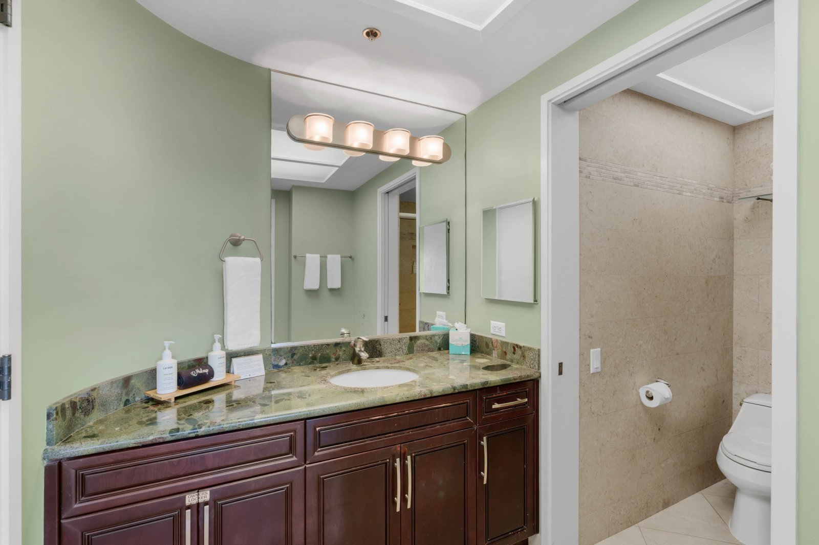 The primary bedroom is furnished with a California king bed and offers a restful retreat with easy access to a bathroom featuring a step-in shower with tub.