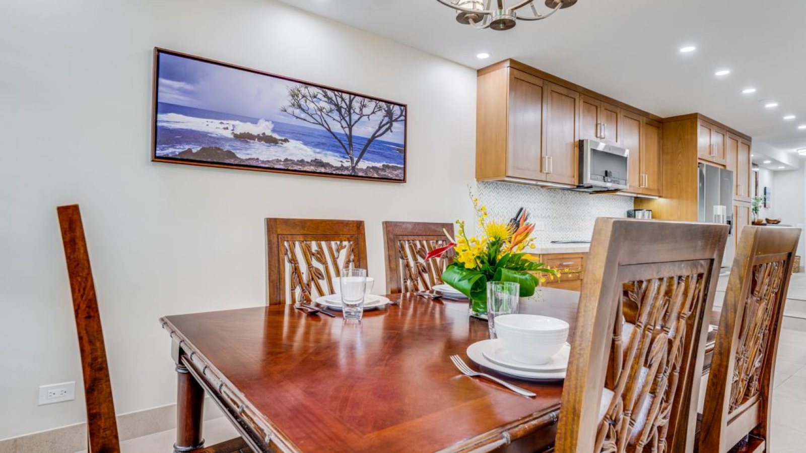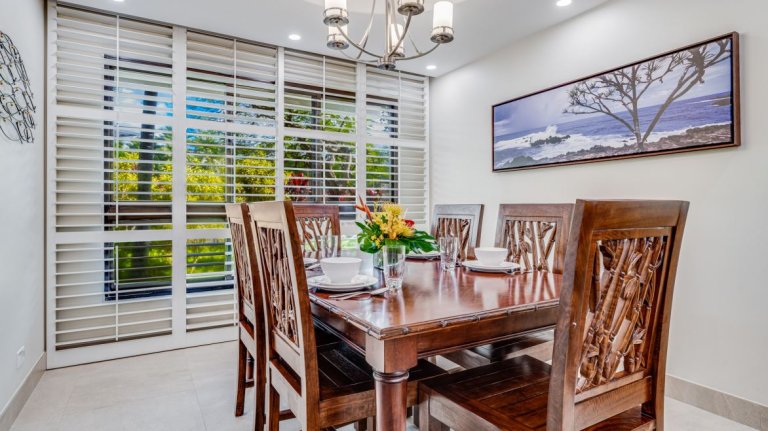 The large private lanai is a highlight of the residence, offering outdoor dining for six and peaceful garden views framed by mature tropical landscaping. It is an ideal setting for morning coffee, afternoon relaxation, or evening dining under the Maui sky.Residence Details