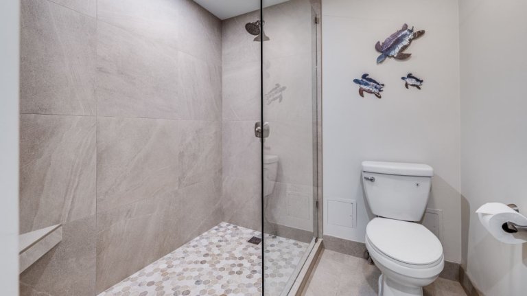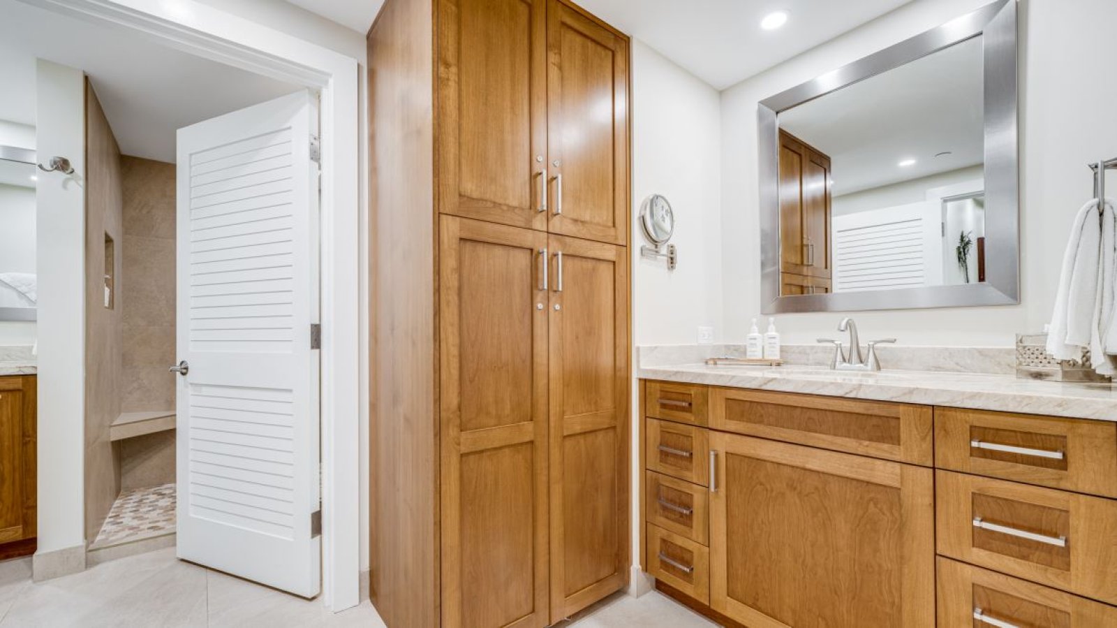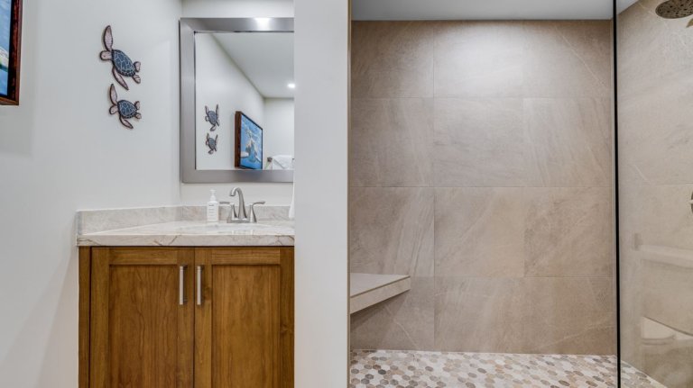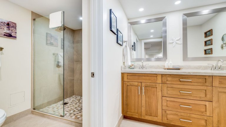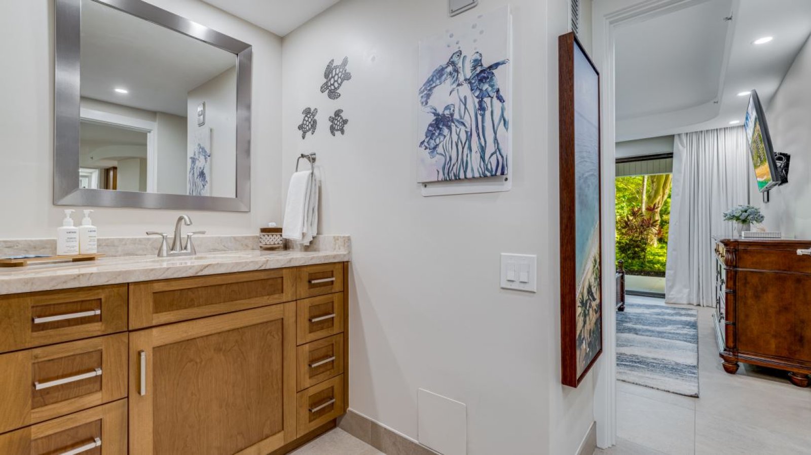 • Primary Bedroom SuiteThe primary bedroom is furnished with a king-size bed, wall-mounted smart television, and direct access to the lanai. The en-suite bathroom features granite countertops and a walk-in shower.